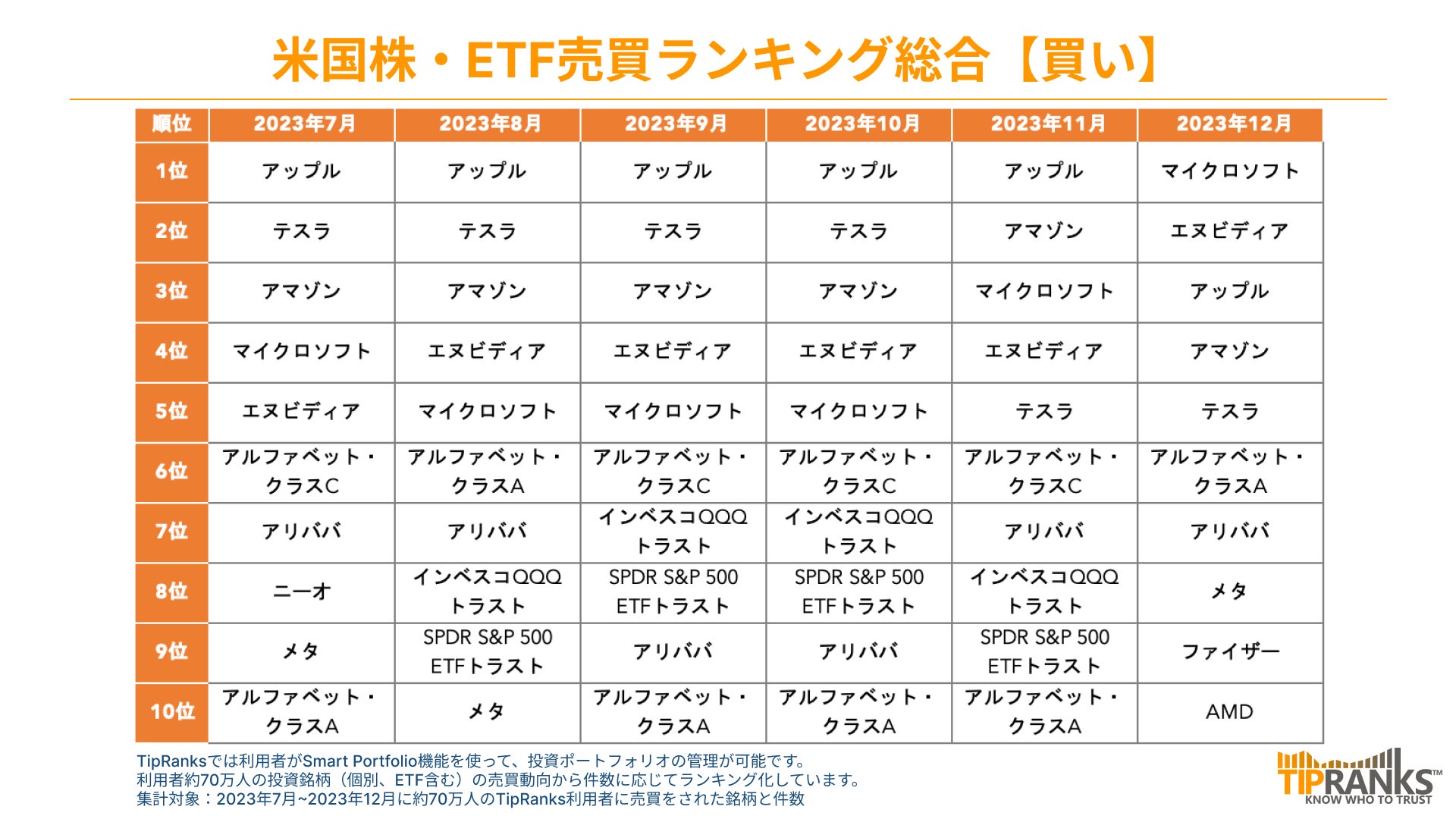 新NISA開始【2023年米国株の人気銘柄動向】メガキャップや主要ETFの追求傾向(調査対象:70万人の海外個人投資家)| 投資分析サービスのTipRanks