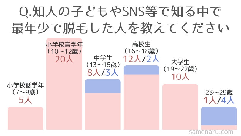 知人の子どもやSNS、ニュース等で知る中で、最年少で脱毛した人の年齢を教えてもらいました。女子の中には、小学校低学年で脱毛を始めている人もいるという結果に。
