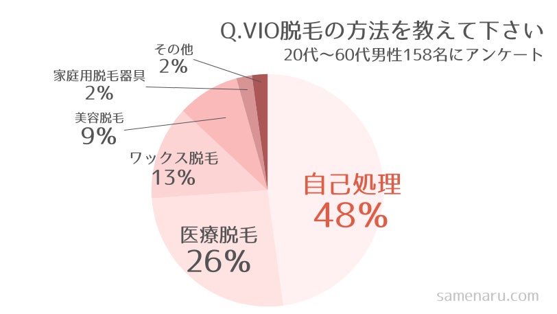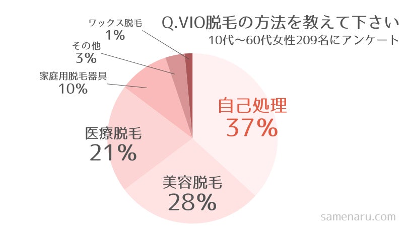シェーバーなどで自己処理している人が一番多いものの、美容脱毛と医療脱毛を合わせると約50%。プロに頼んで脱毛した人が約半数という結果でした。