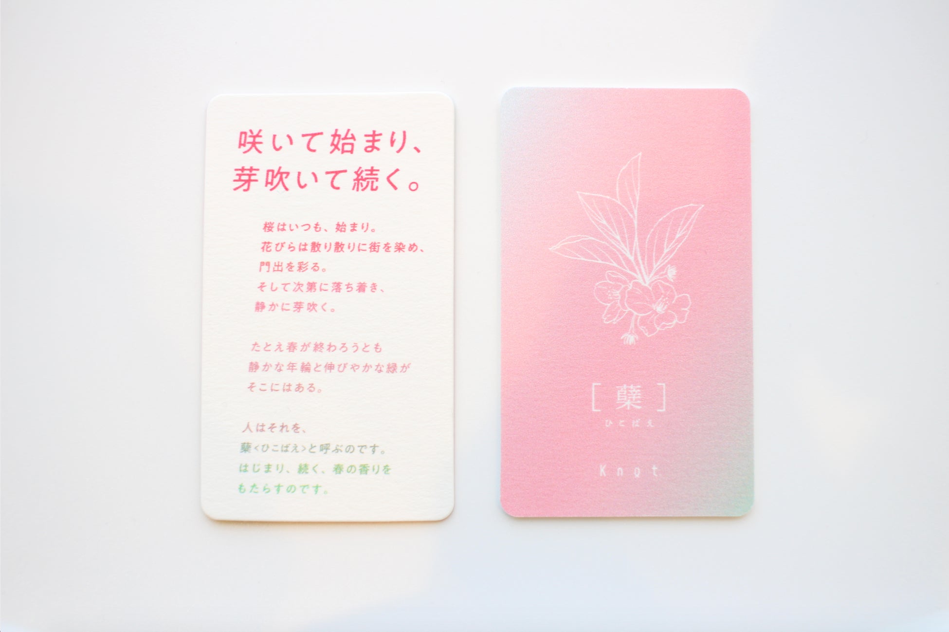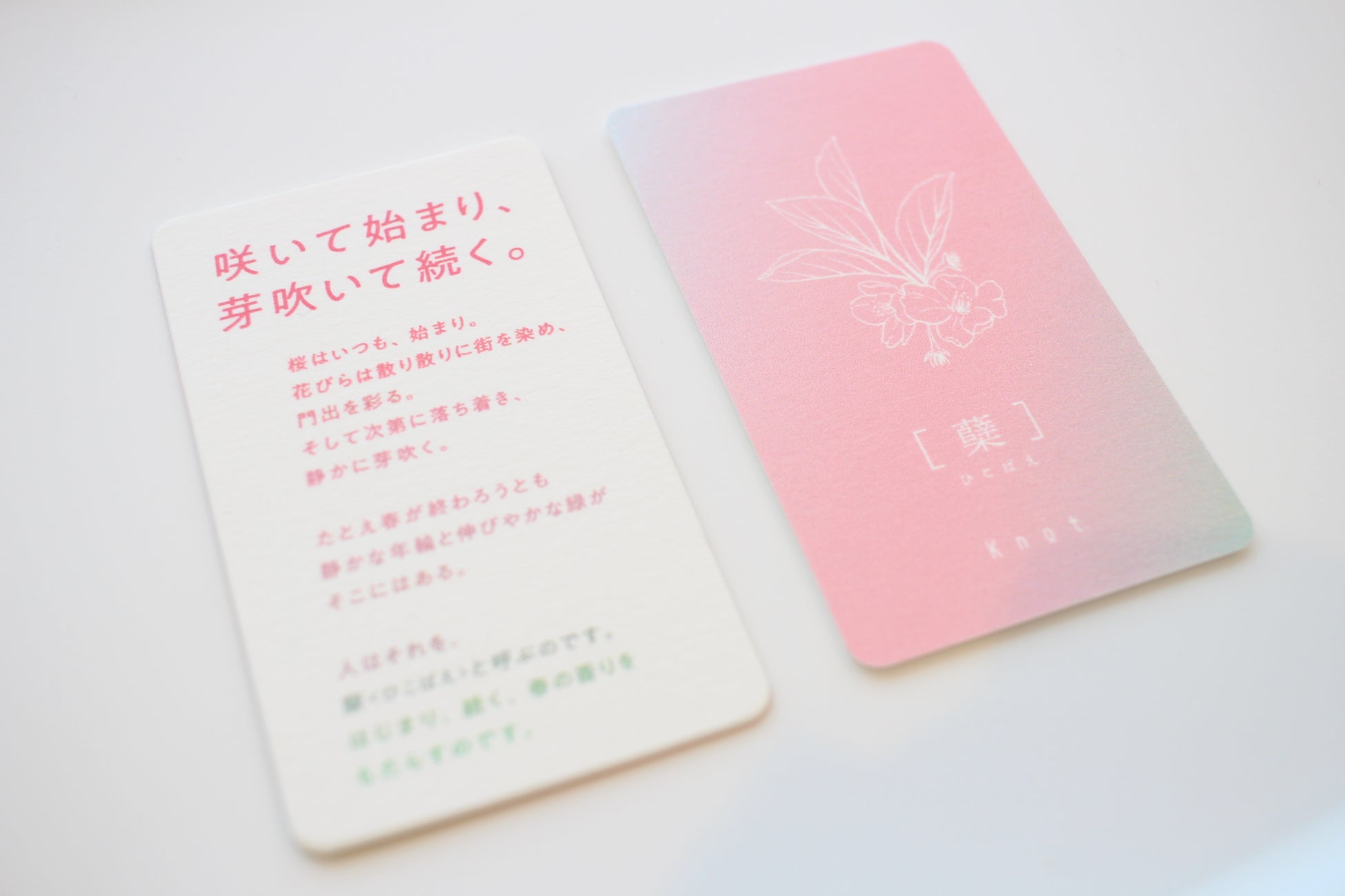 限定モデルの文字盤には桜の木が使用されていることから、春の始まりを予感させる桜の淡い甘さを。「蘖」という新芽を想起させるコンセプトから、咲いた後も芽吹いて続く木々と新緑の力強さを。そして、Knotというブランド自体が持つあたたかくニュートラルな印象を。それらを香りの設計に取り入れ、13種類の天然精油をブレンドすることで表現し、一枚のフレグランスカードに仕立てました。