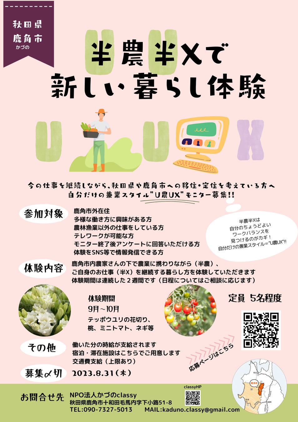 秋田県や鹿角市への移住・定住を考えている方へ。NPO法人かづのclassyが、秋田県での半農半X体験をサポートいたします。