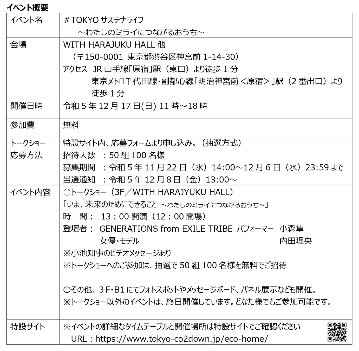 この度、若い世代の方にも、環境に配慮した住まいという選択肢があることを知っていただくため、 「#TOKYOサステナライフ ~わたしのミライにつながるおうち~」 と題したイベントを、原宿の複合施設「WITH HARAJUKU」にて開催します。