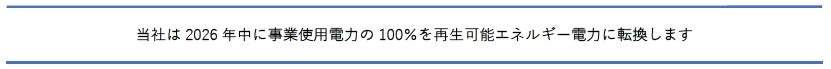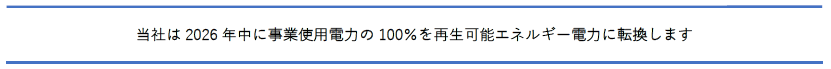 当社は事業使用電力の100%を再生可能エネルギー電力に転換する目標期限を「2026年」と設定しました。なお、事業使用電力の範囲は連結対象の全グループ会社が対象です。