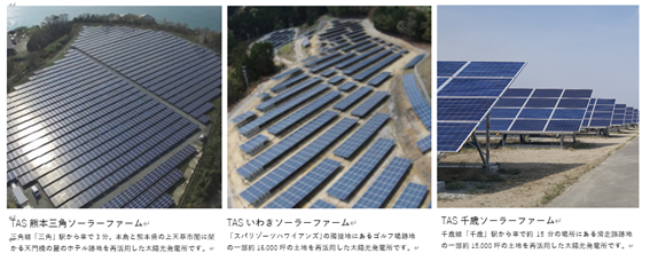 当社は、グループの持つ不動産開発力を活かし、2015年より遊休地での再生可能エネルギー発電所の開発を開始しております。現在、TAS熊本三角ソーラーファーム、TASいわきソーラーファーム、TAS千歳ソーラーファームの3カ所において太陽光発事業を行っています。いずれも2メガクラスの大型発電所であり、FIT(固定価格買取制度)を活用した発電事業を展開しています。
