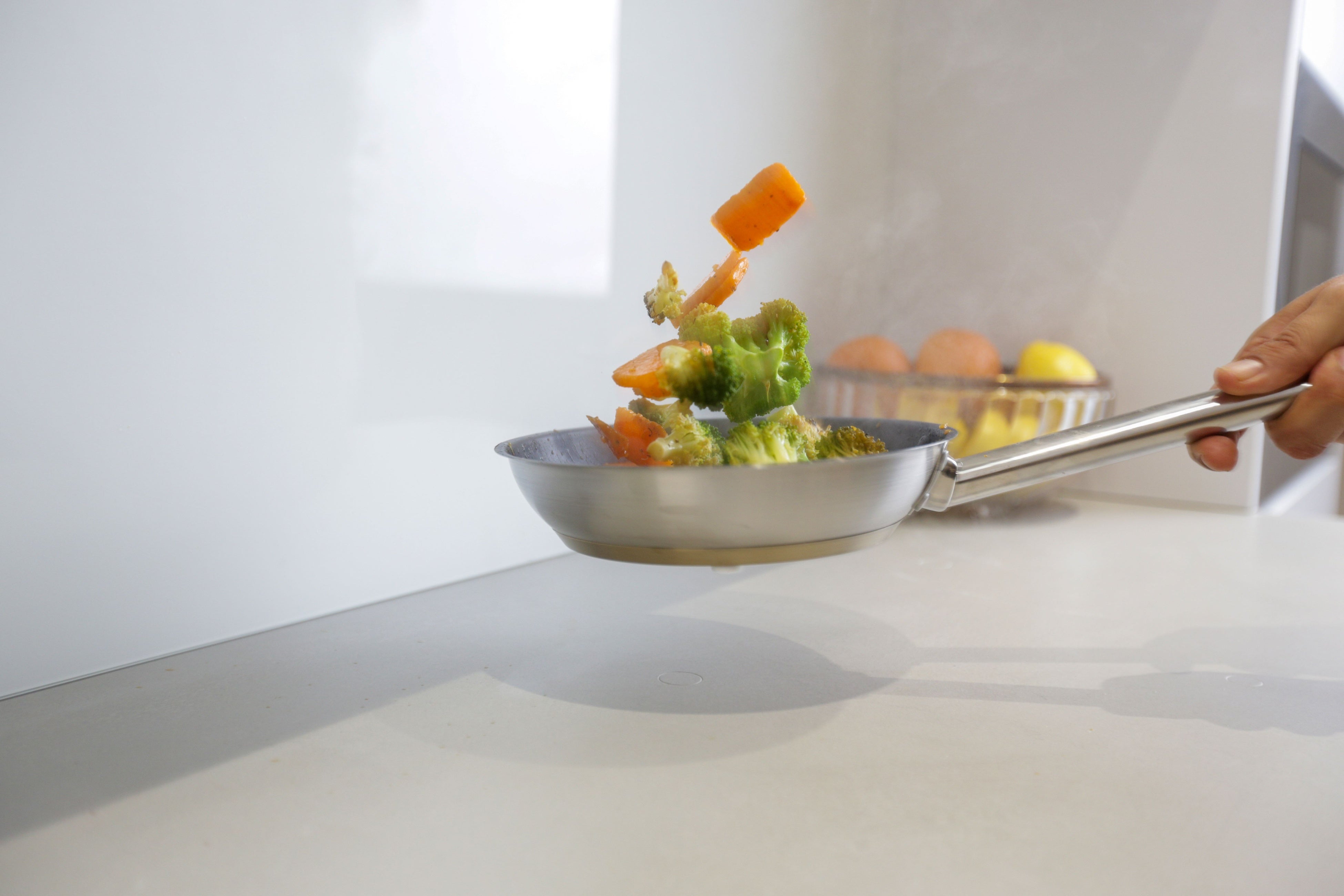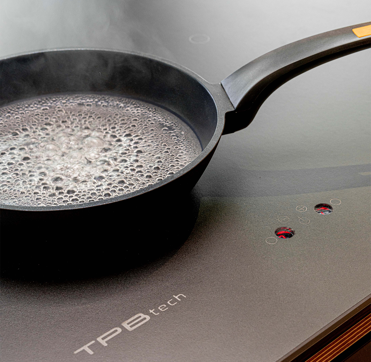 「TPB tech」のIHはワークトップの下に組み込まれており、ワークトップのセラミックトップ上で直接加熱調理が行えます。そのメリットは想像を超え、下ごしらえ・調理はもちろんのこと食事や後片付けまで、ずっと快適でスタイリッシュなものになります。何よりこれまでにない意匠性のワークトップは訪問客の視線を釘付けにします。