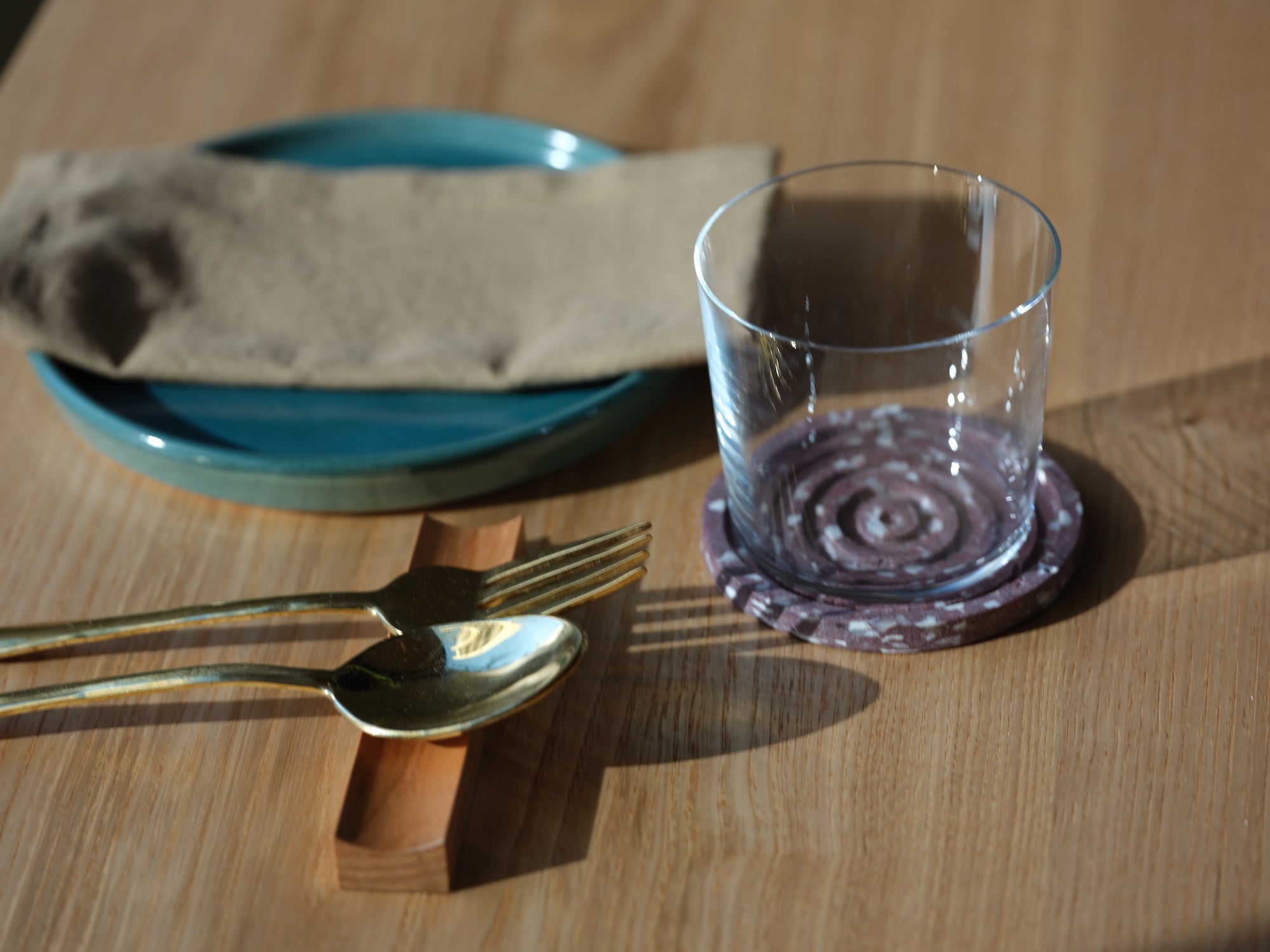 銃弾の空薬莢から作ったオリジナルカトラリーや、使用済みプラスチックでできたコースター。