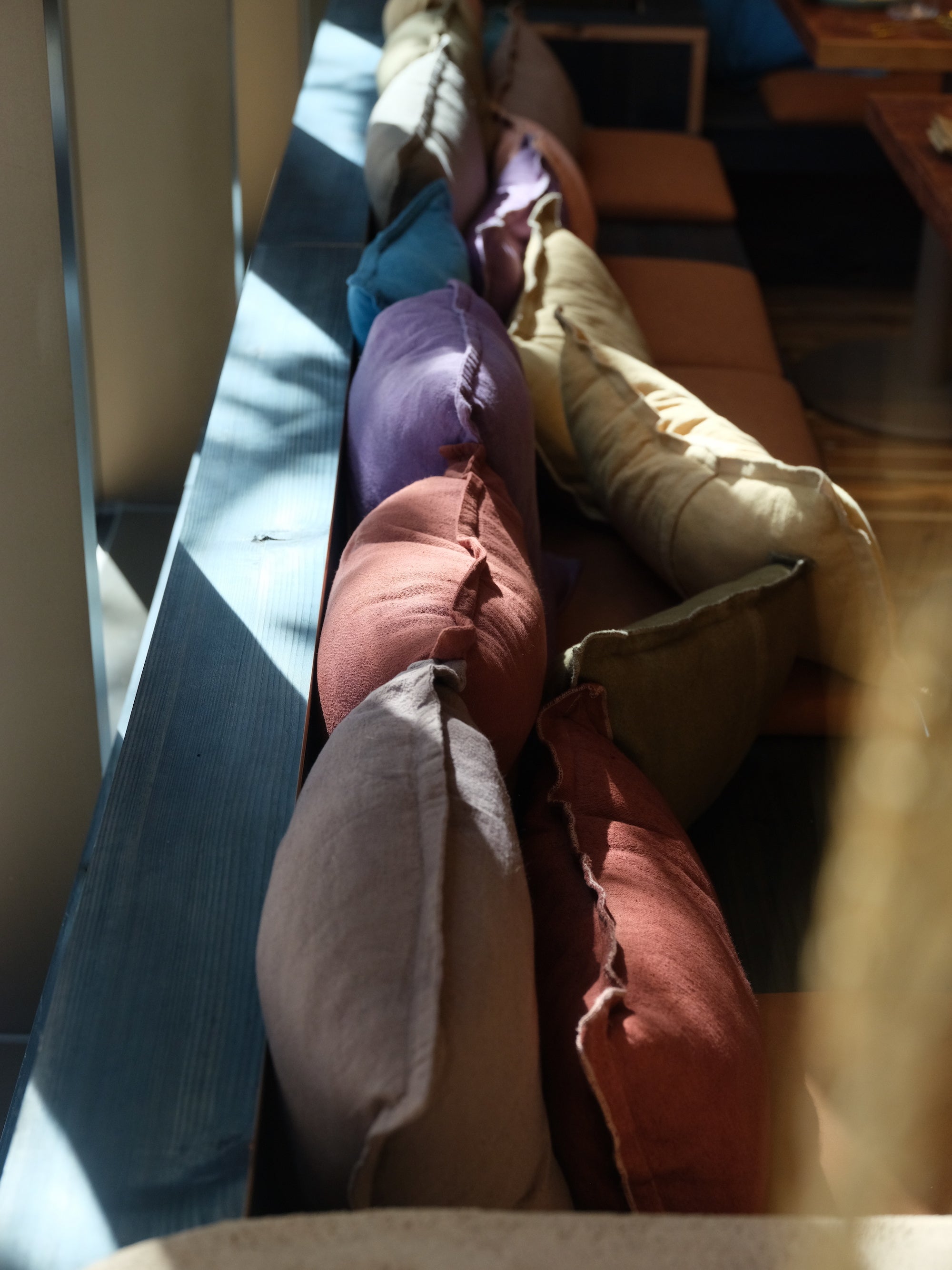 ソファには、野菜の皮や緑茶紅茶など食品廃棄物で染めた自然の風合いを楽しめるクッションが並ぶ。