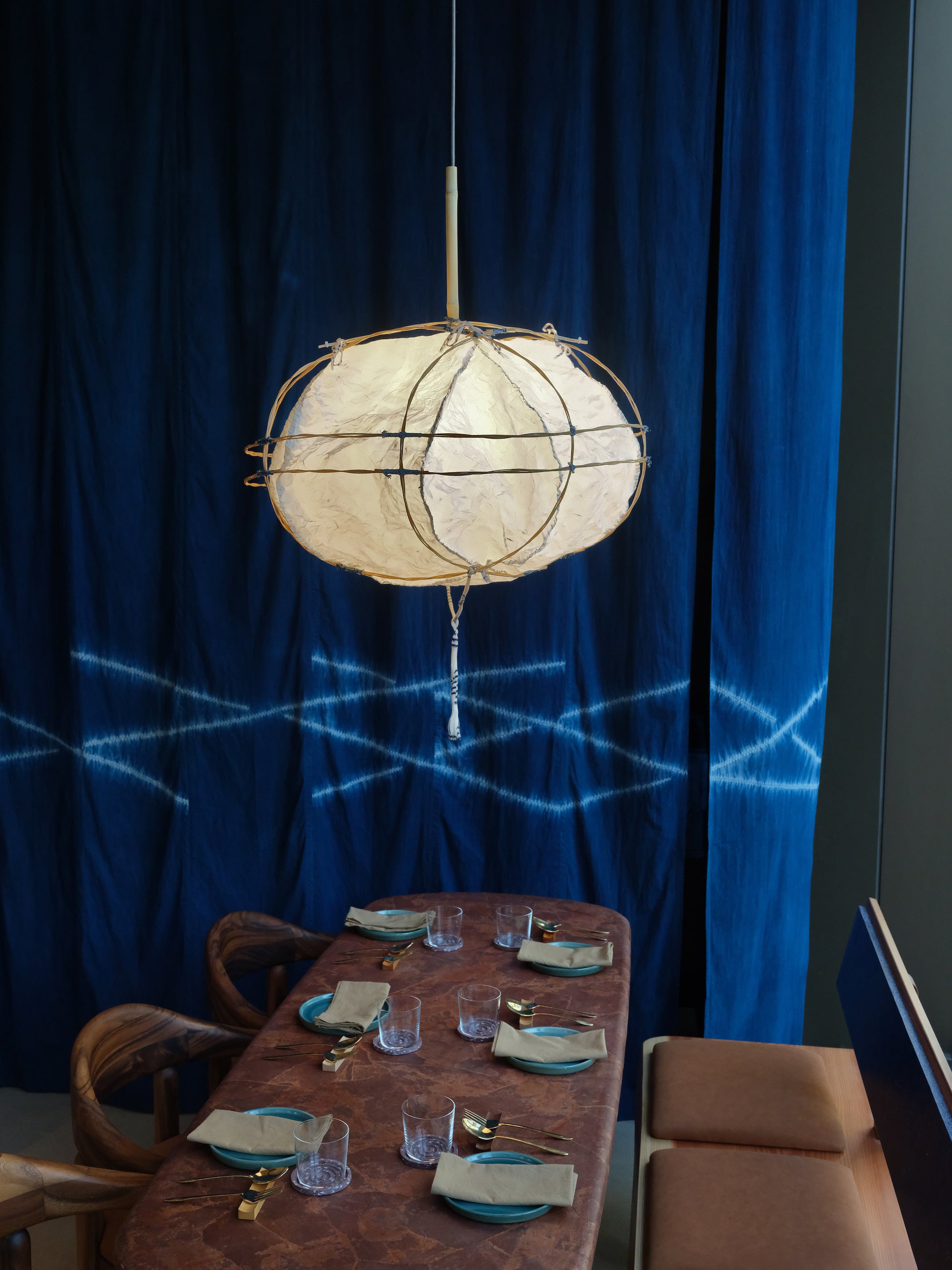 ベトナム サパ 少数民族の伝統手法で作る美しい藍染のカーテン、海藻と和紙でできた芸術的フォルムの照明。