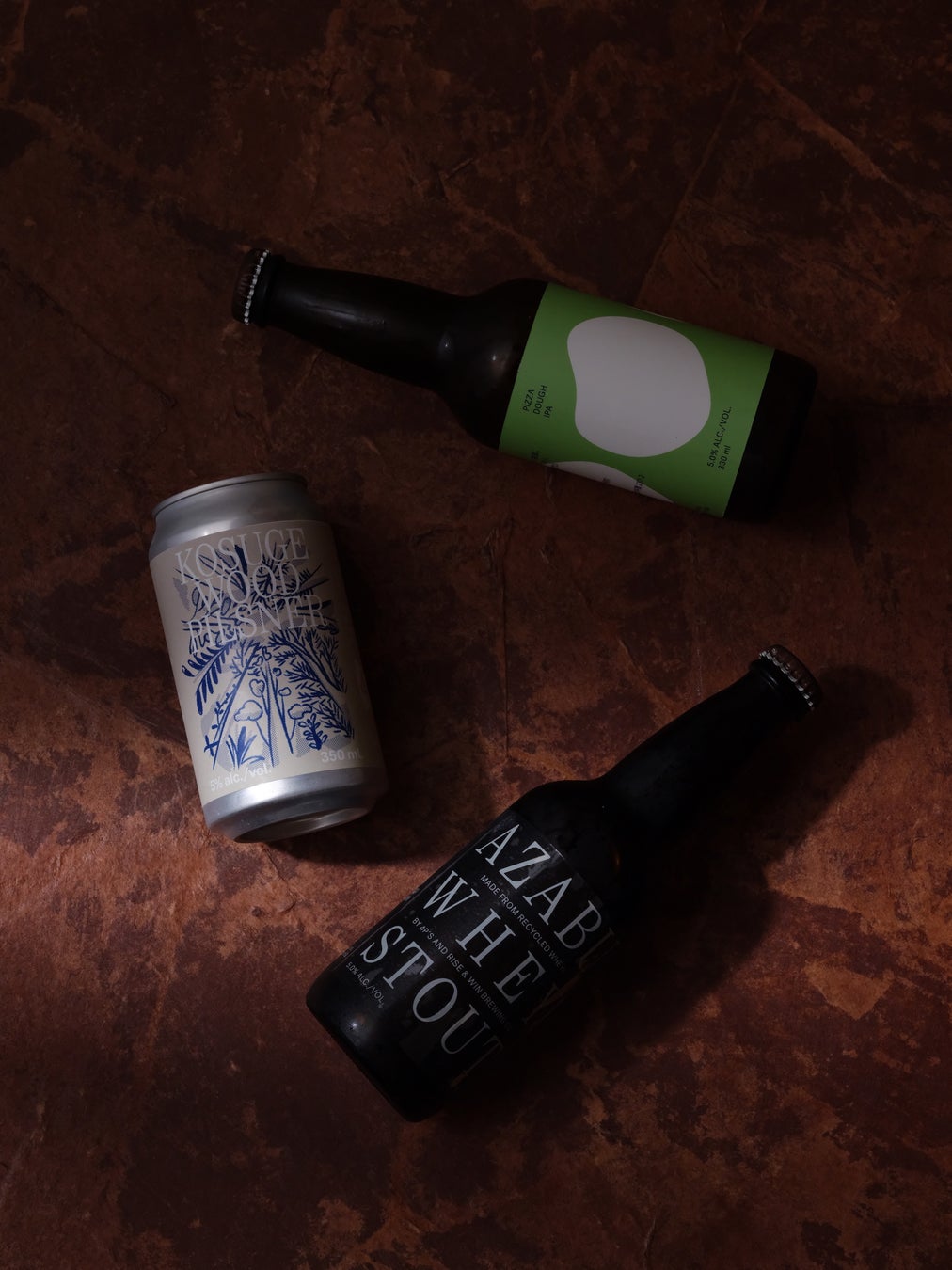 新鮮な味わいが楽しめる、廃棄ホエイのスタウトやピザ生地を使ったIPA、杉とヒノキのピルスナーの2種類は、ギフトにも。