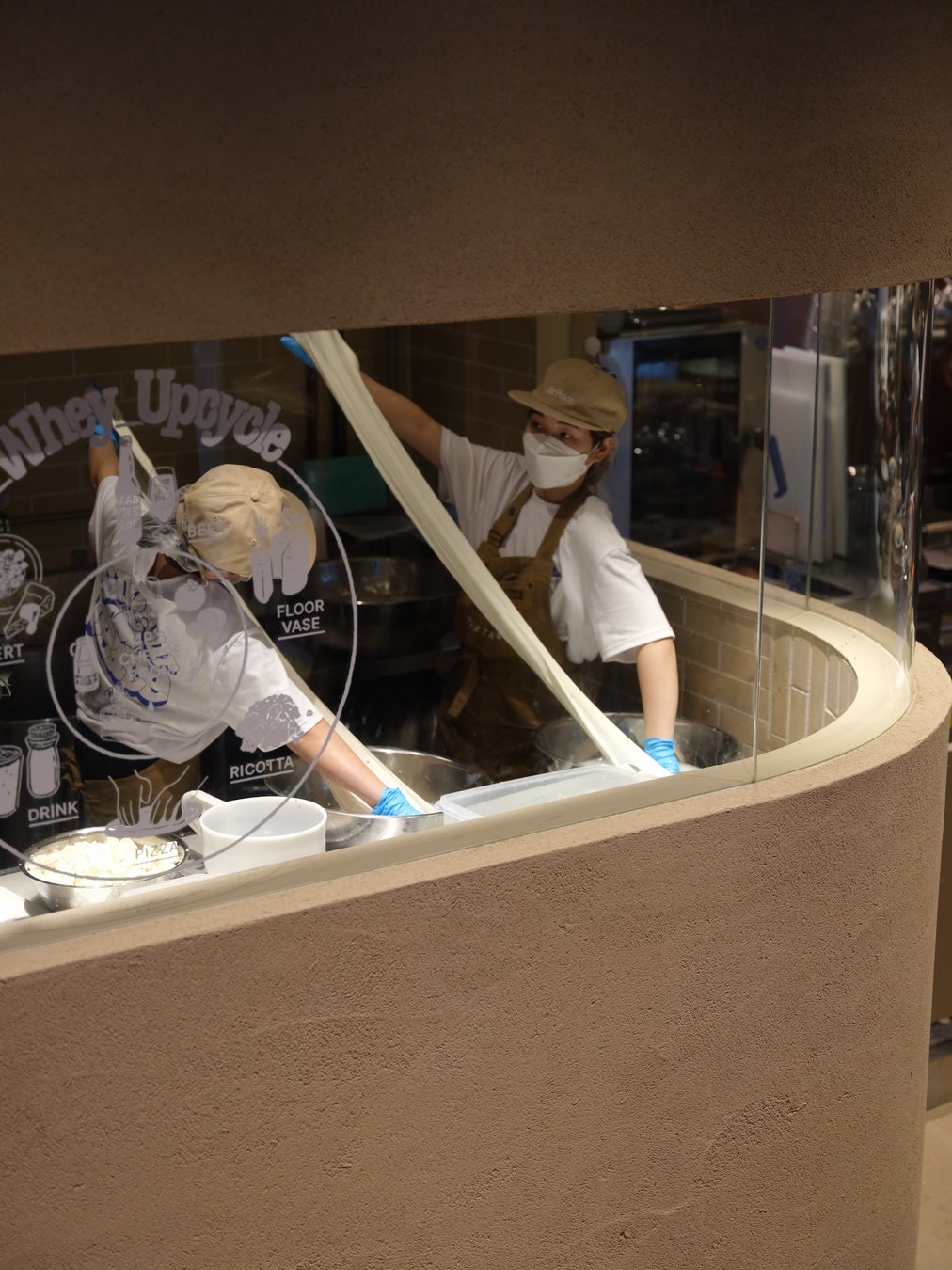 熟練の職人がひとつひとつ手作業でチーズを作る、店内中央のチーズ工房。ダイナミックな動きにも注目。
