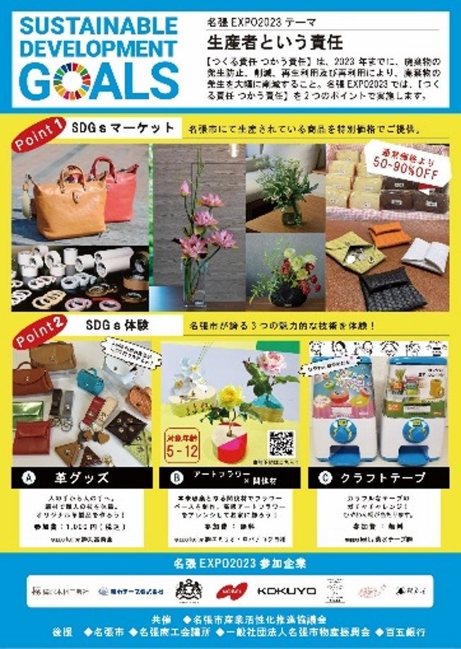 今回初開催となる「名張EXPO 2023」は、名張市にある物づくり企業が集まり開催するイベントで、SDGsをテーマに1日限定入場無料で開催いたします。当社はSDGs17の目標のうち、12番目の項目である「つくる責任つかう責任」(廃棄物の発生防止、削減、再生利用及び再利用、廃棄物の発生を大幅に削減すること)を、2023年中までに達成することを目指しています。「名張EXP0 2023」では、地域企業と名張市民がイベントを通して「つくる責任つかう責任」を体験できる内容となっています。