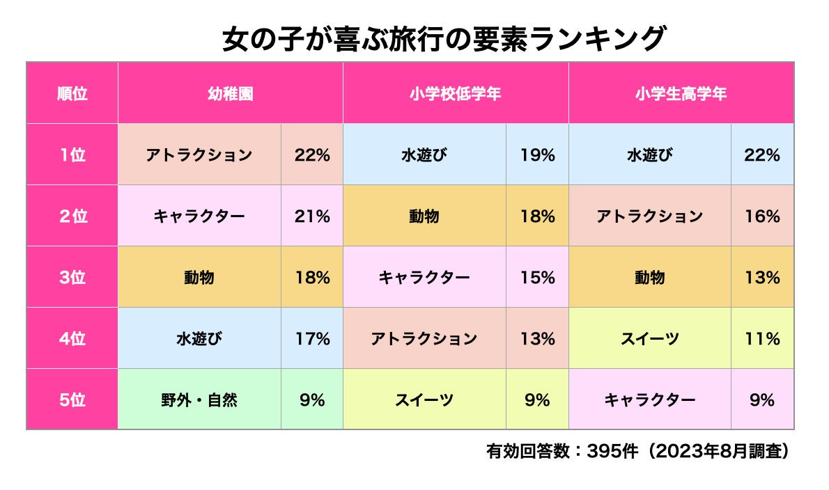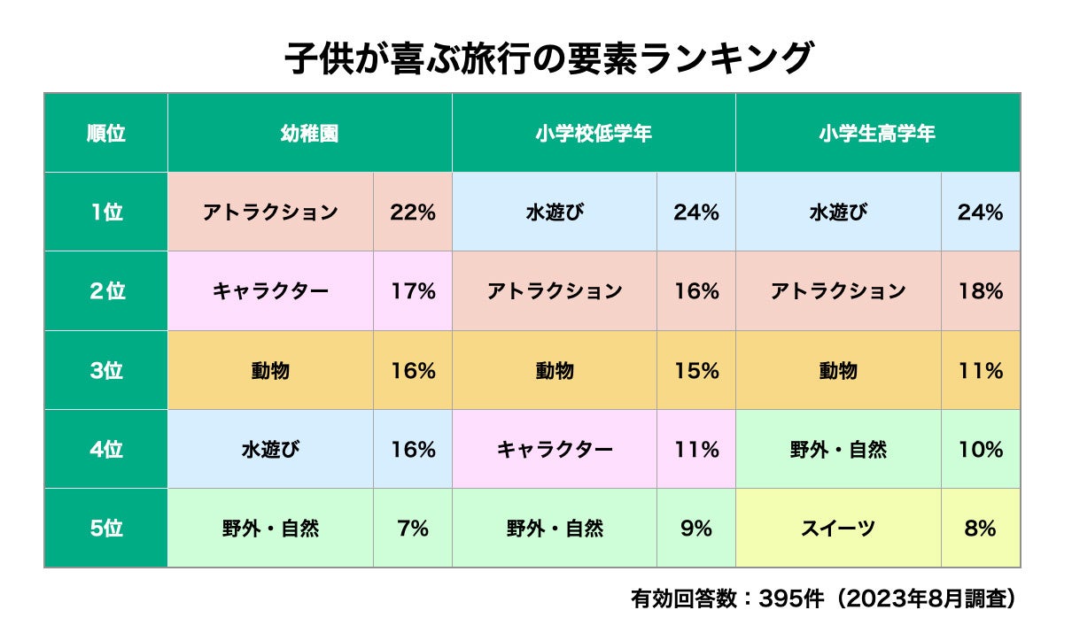 一方で、大人の旅行では人気の「食」「景色」「季節のイベント」の3つの要素は子供にとっては旅行を楽しむ上で重要な要素ではなさそうです。3つともTOP5には入りませんでした。