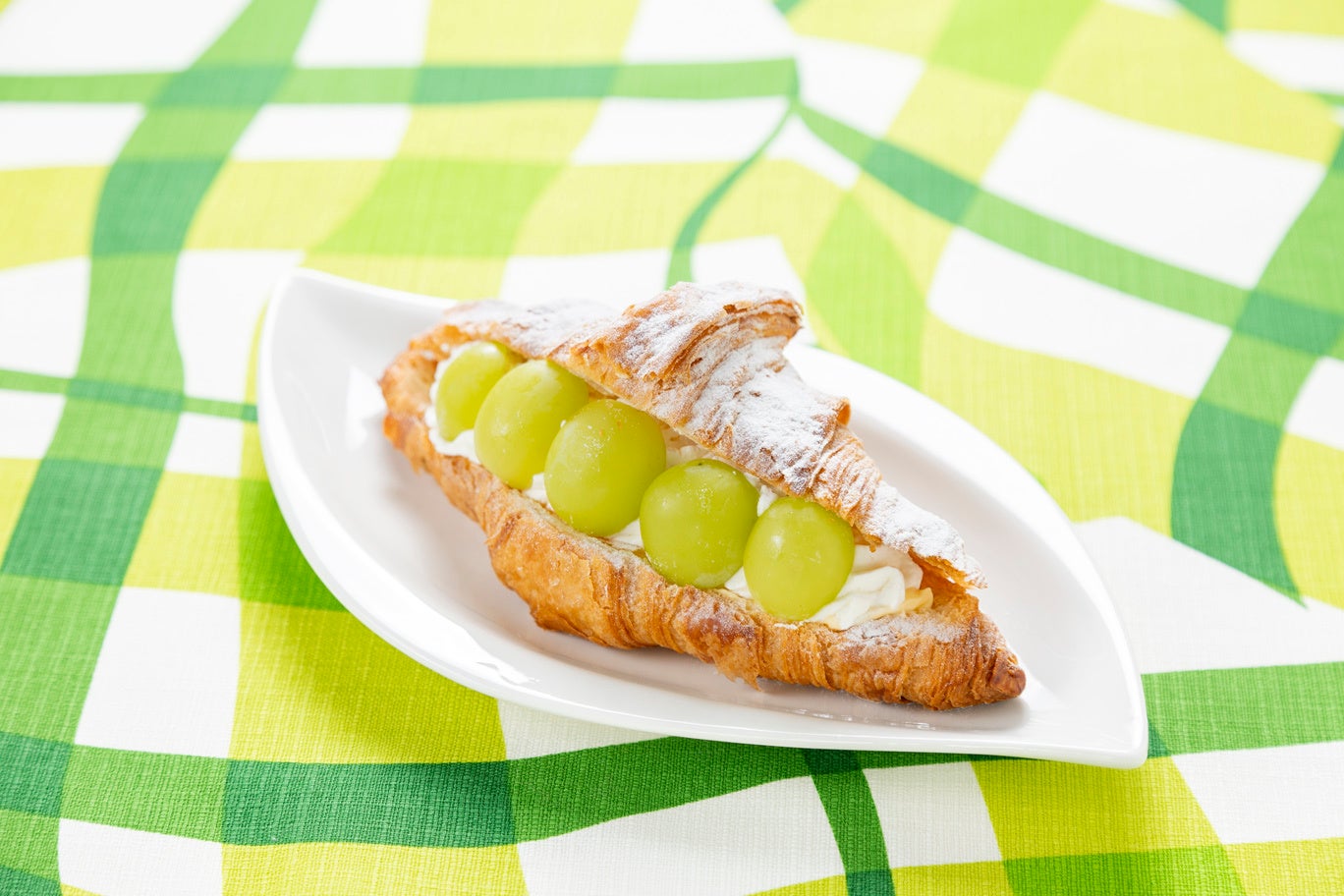 限定スイーツは、ふわふわな軽い食感の”スフレチーズケーキ”とサクサクなクロワッサンにカスタードクリームと甘さ控えめな生クリームとフレッシュな”シャインマスカット”をサンドした贅沢なスイーツです。