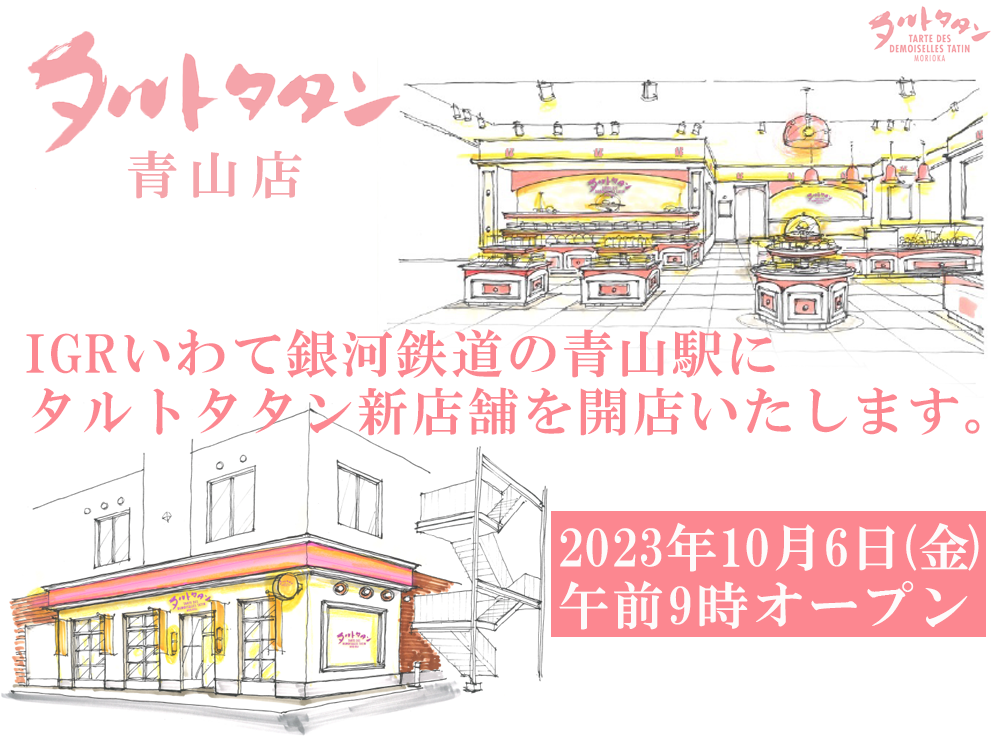 タルトタタン株式会社(本社:盛岡市、代表取締役:小松豊)は、IGR青山駅内に新しい店舗「タルトタタン 青山店」を10月6日(金)オープンします。