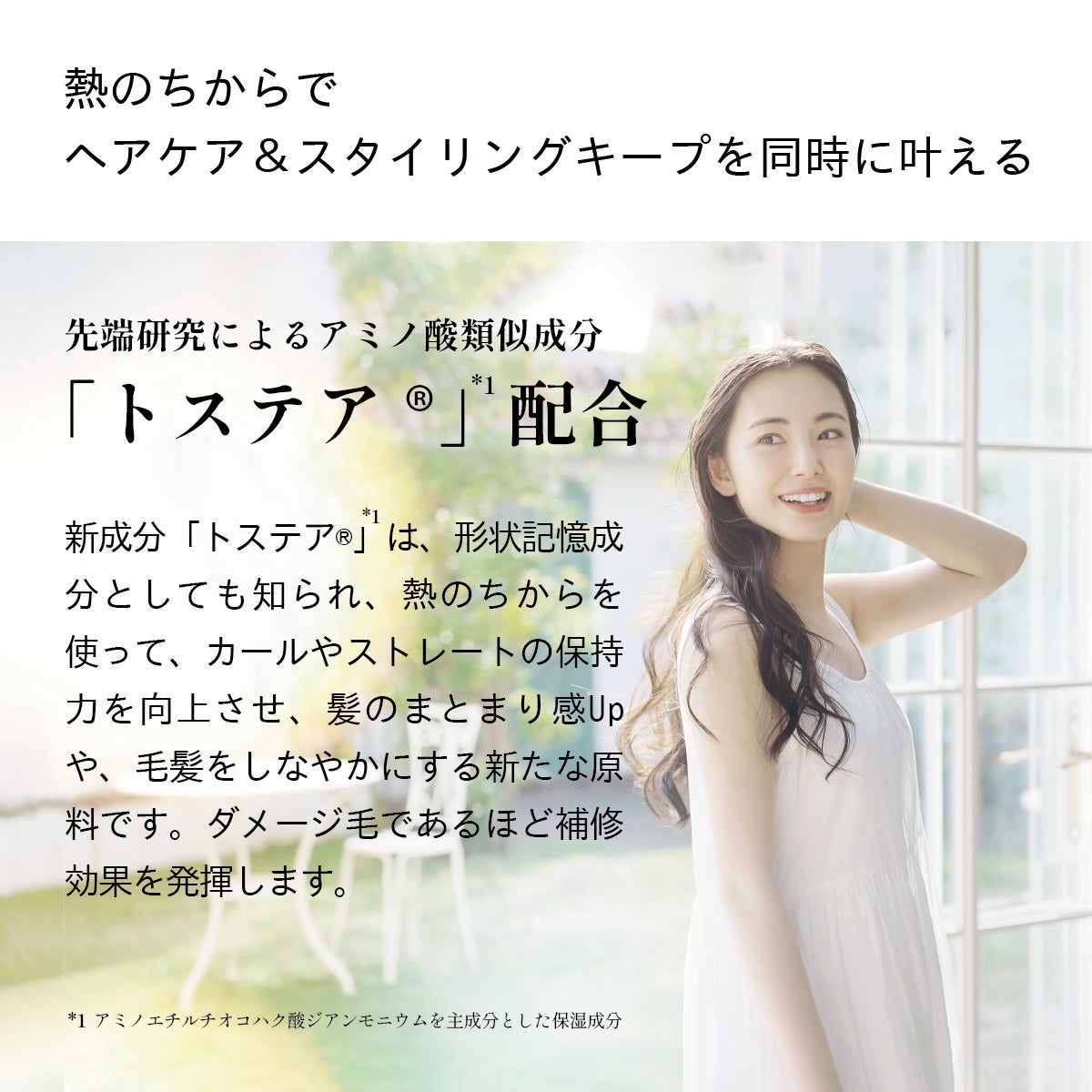 そんな思いから生まれたアイロン用ヘアトリートメントミスト(洗い流さないトリートメント)です。先端研究から生まれた成分「トステア®︎」*1を配合し、熱を味方にダメージ補修しながら形状記憶成分により長時間しっかりスタイリングをキープします。ヘアケア&スタイリングキープを同時に叶え、髪のダメージを補修するためサロン後のホームケア(退色防止等)としてもお使いいただけます。