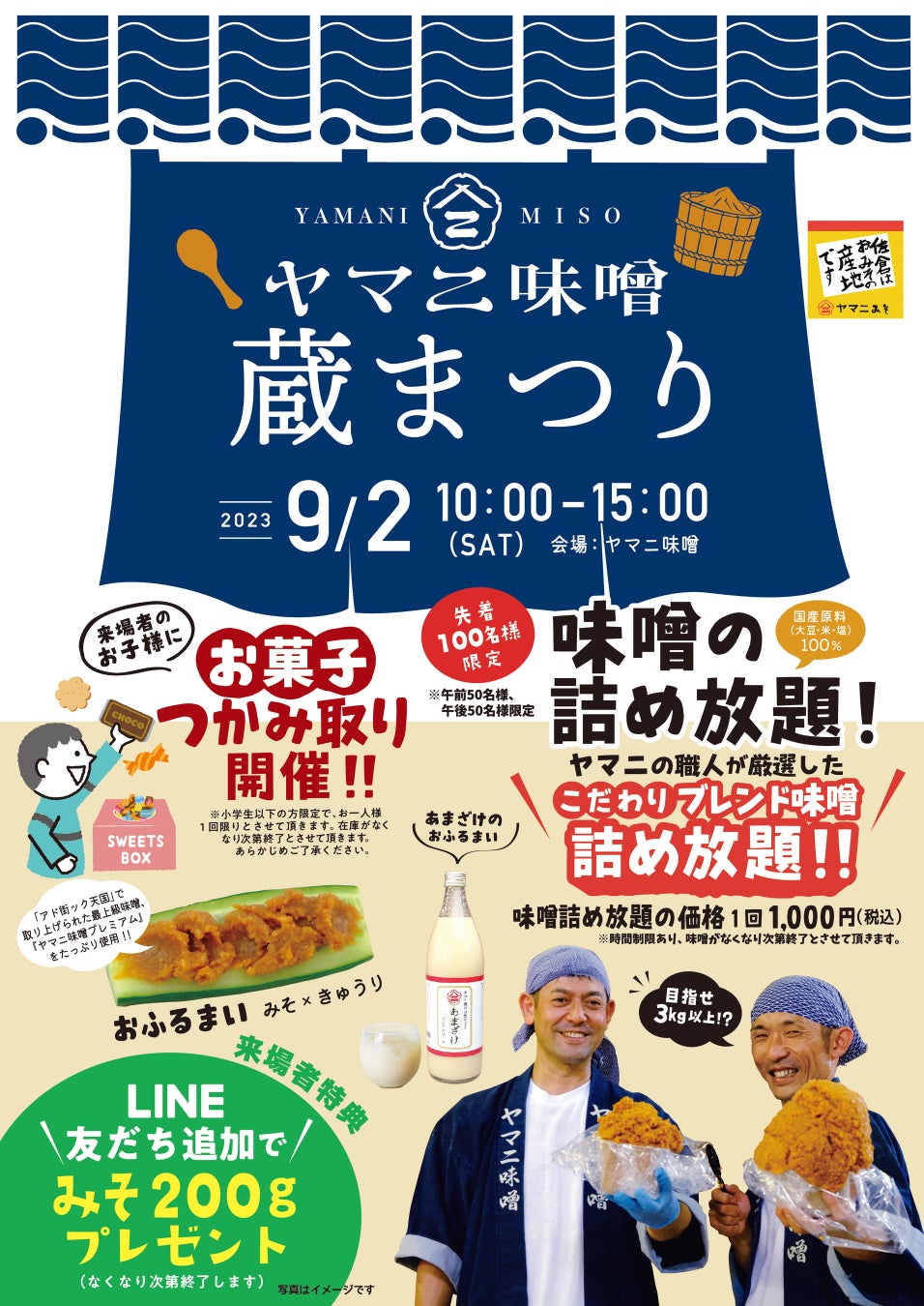 株式会社ヤマニ味噌(千葉県佐倉市)は、創業136年で初となる蔵びらきイベント「ヤマニ味噌 蔵まつり」を9月2日(土)に当社本社にて開催いたします。味噌蔵の見学や味噌の詰め放題、数量限定で甘酒や味噌きゅうりを来場者にふるまうほか、お菓子つかみ取りなどお子様やご家族連れでお楽しみいただける催しを多数用意しています。