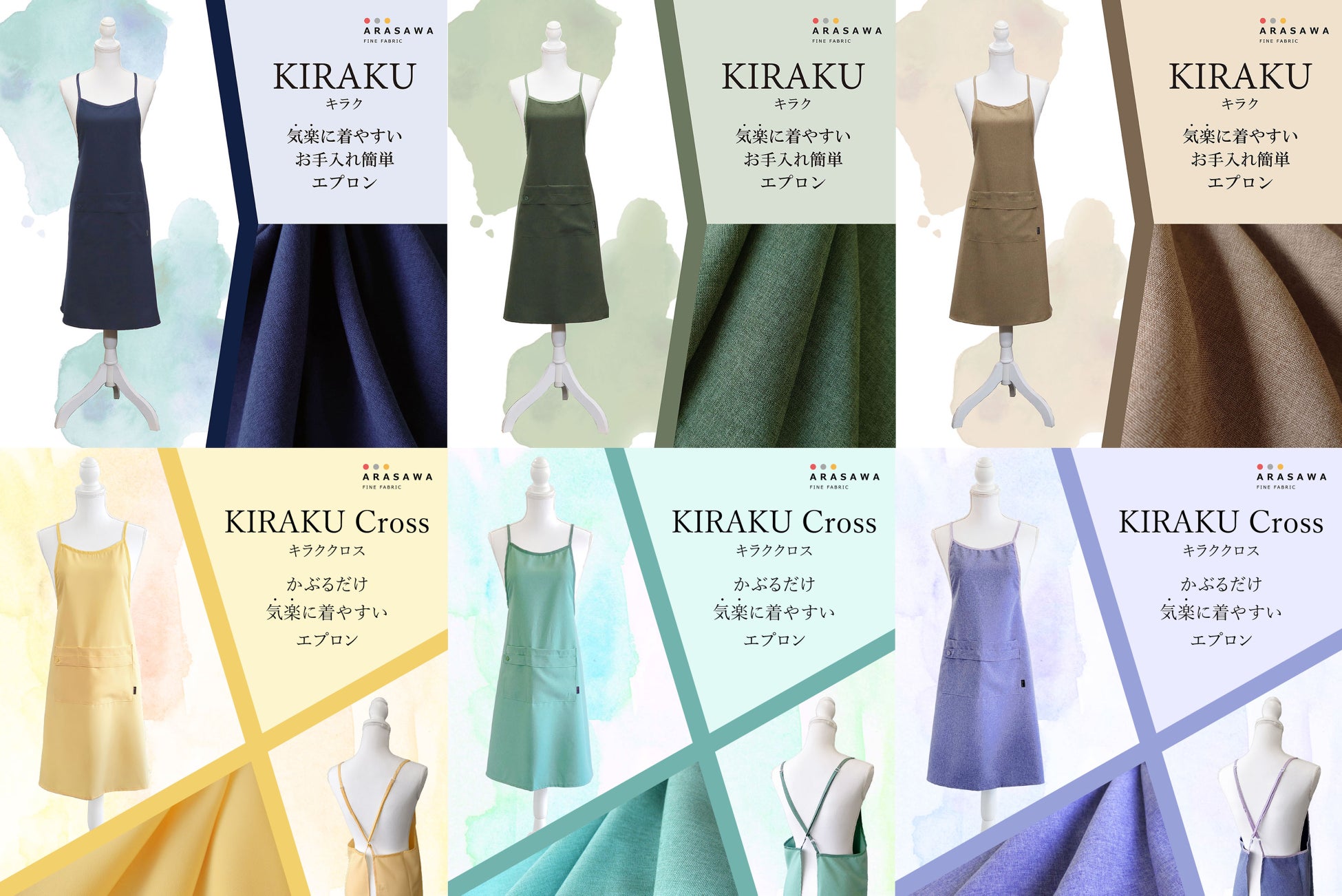楽に着られる、お手入れ簡単エプロン「KIRAKU(キラク)」。日常で使いやすく、気楽に着られることを追求しながらも、スタイルが美しく見えるよう設計されたエプロンとして好評販売中。