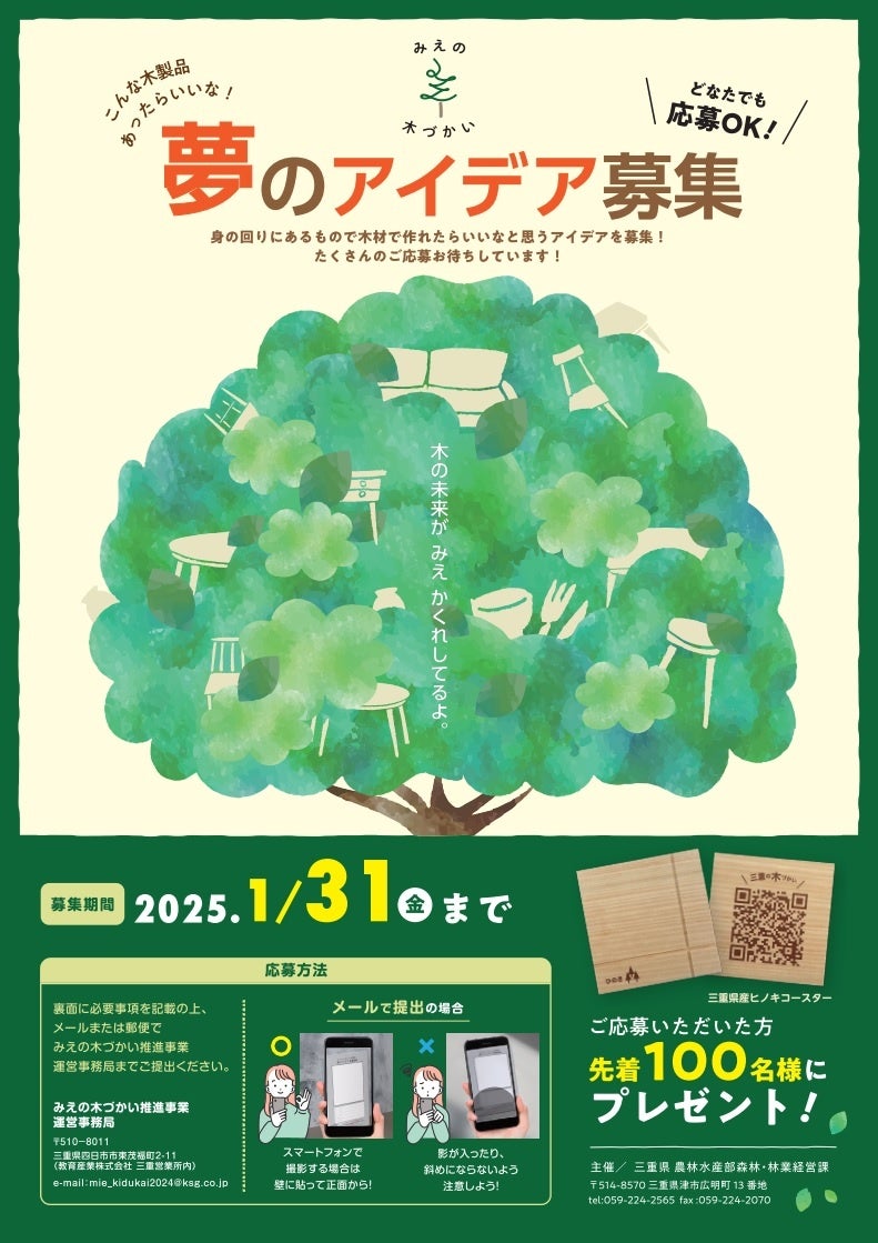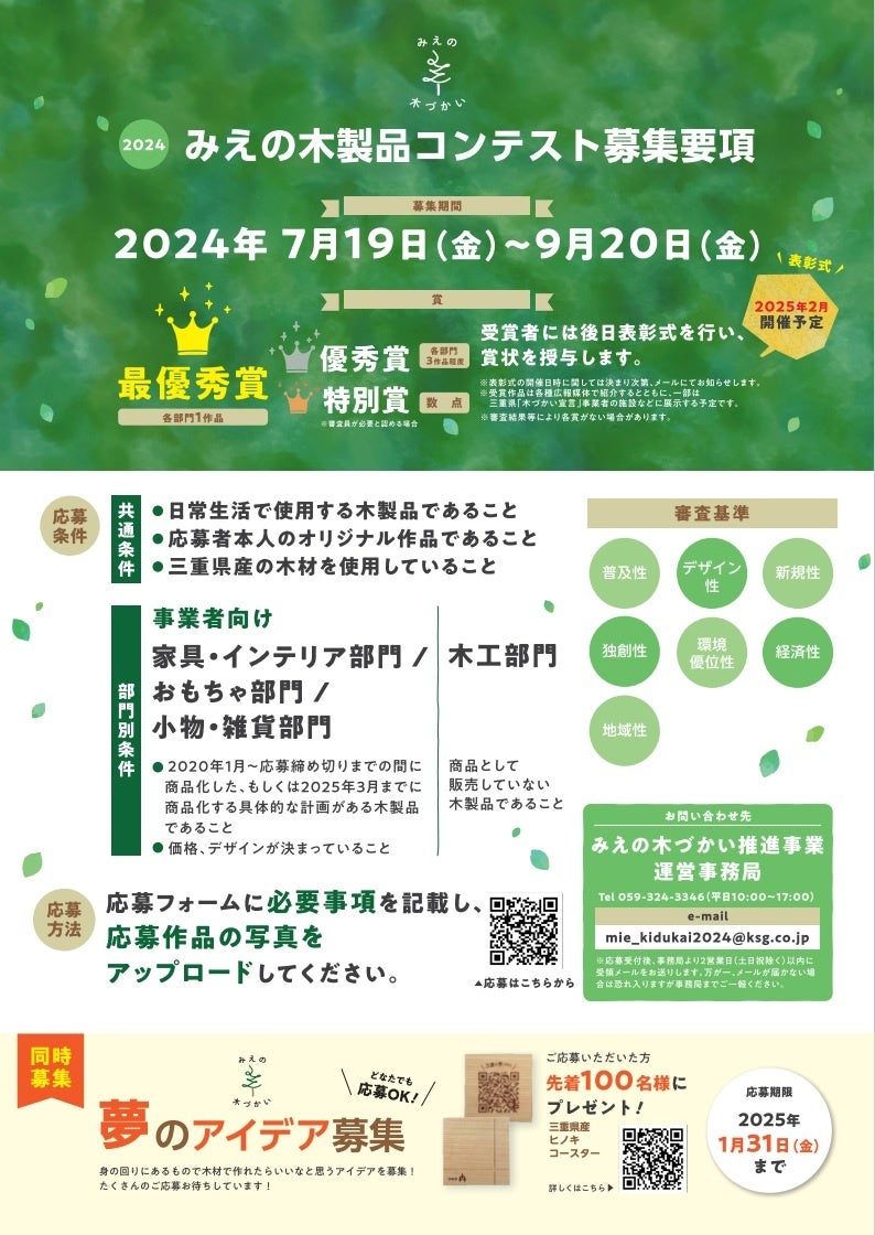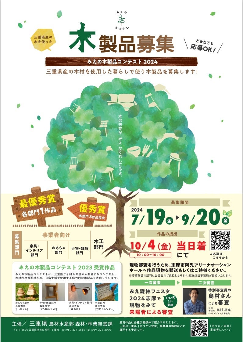 その一環として、日常生活で使用する魅力的な木製品を表彰し、PRする「みえの木製品コンテスト」を令和4年度から開催しており、以下のとおり令和6年度の募集を開始しました。