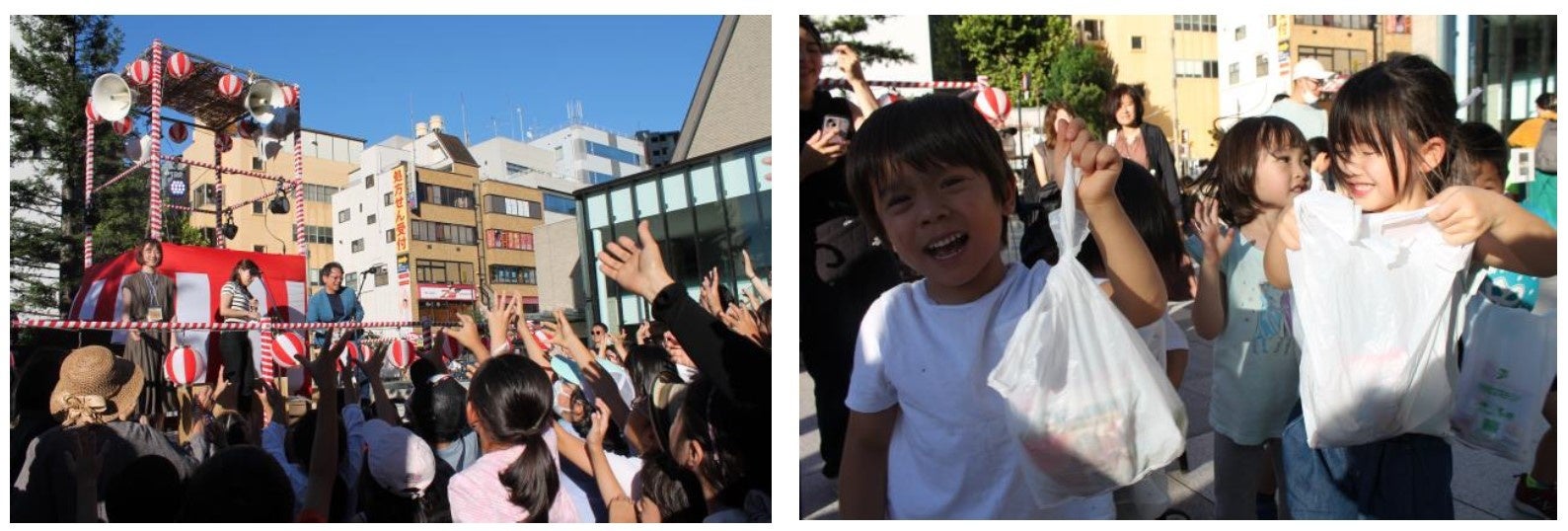 やぐらから会場に集まった子どもたちへのプレゼントとして株式会社JMの大竹社長より、お菓子まきがおこなわれました。袋に入ったたくさんのお菓子を手にした子どもたちからは満面の笑みが見られました。