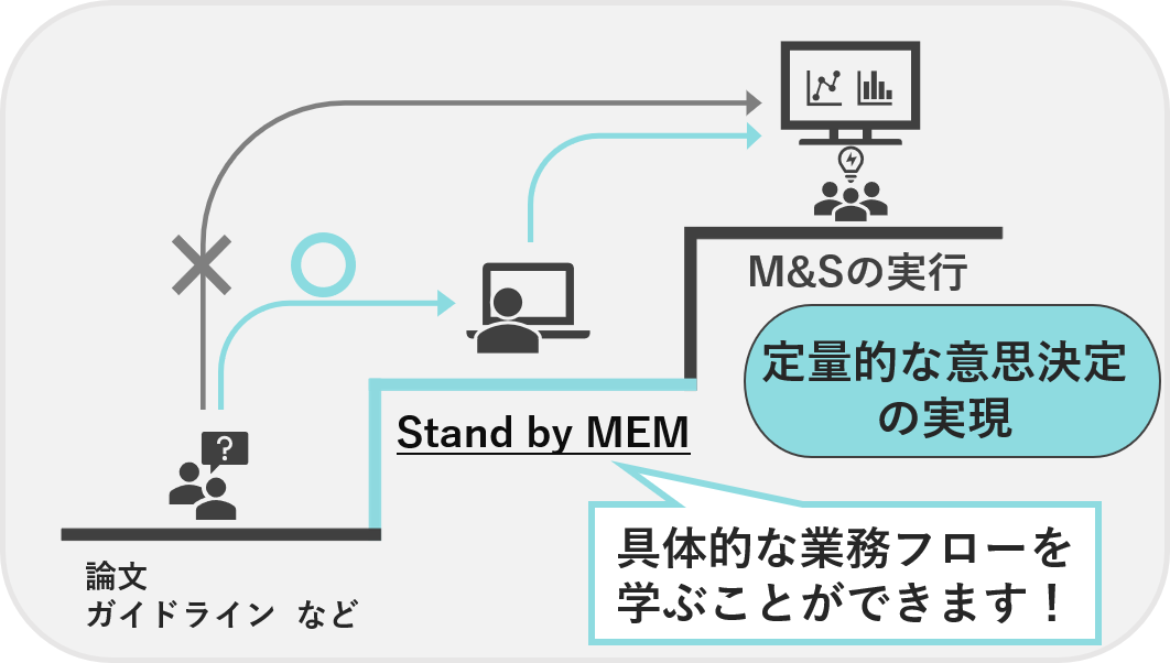 弊社は、「Stand by MEM」によりeラーニングでM&Sの具体的な業務フローを学んでいただく機会を提供することで、定量的な意思決定の実現に寄与し、【患者様へよい薬をより早くお届けする】という、ライフサイエンスに関わる全ての企業の目標達成に貢献します。