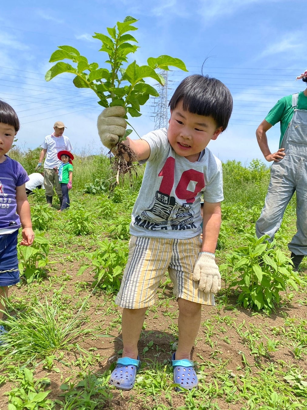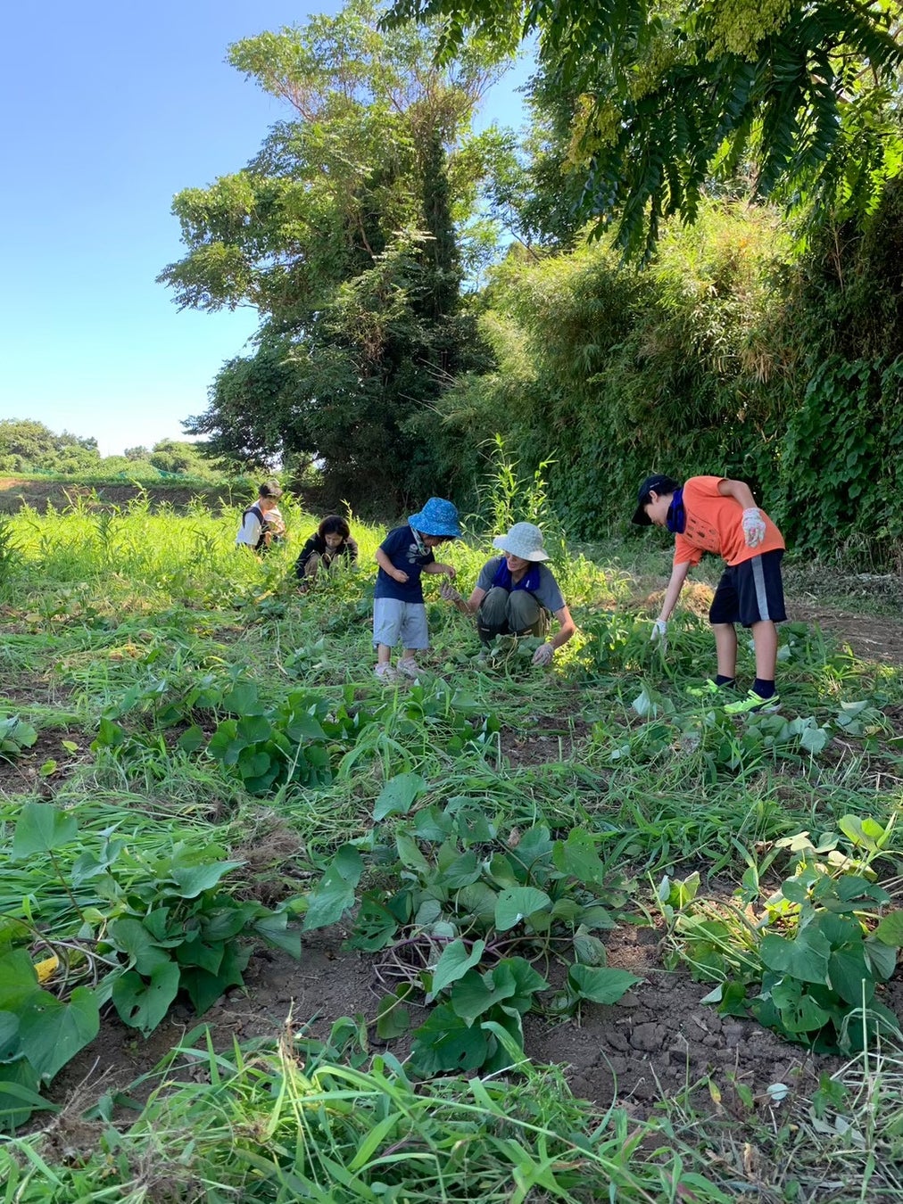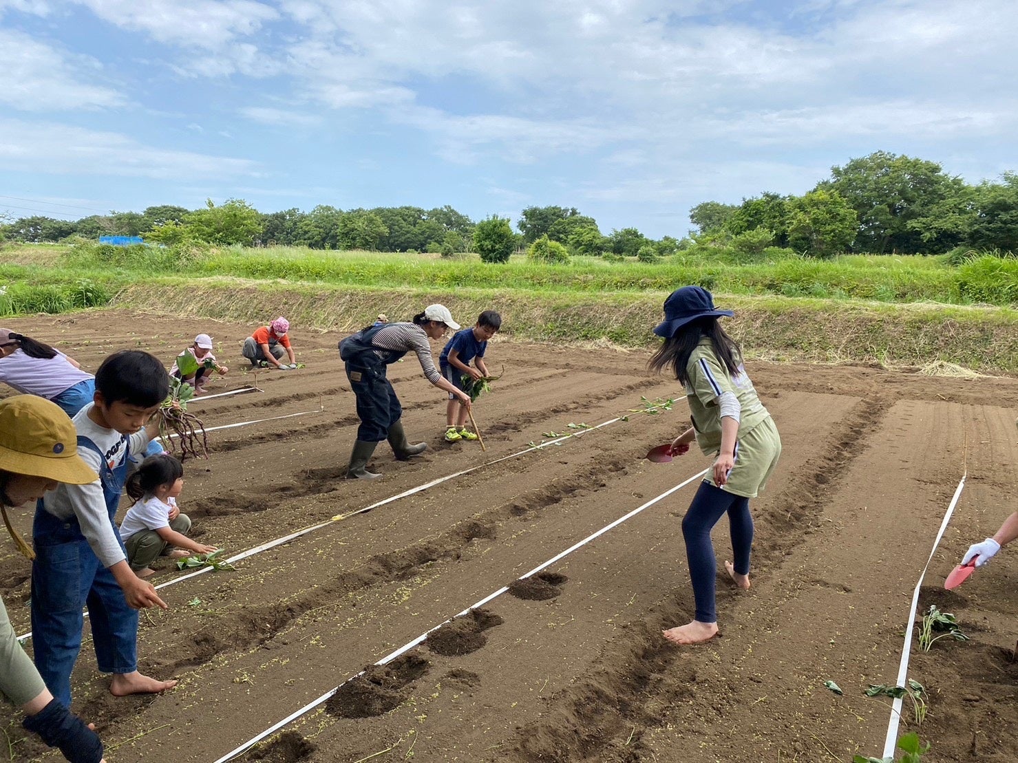 安心安全の土の畑で、裸足になって体験する子どもが多い。