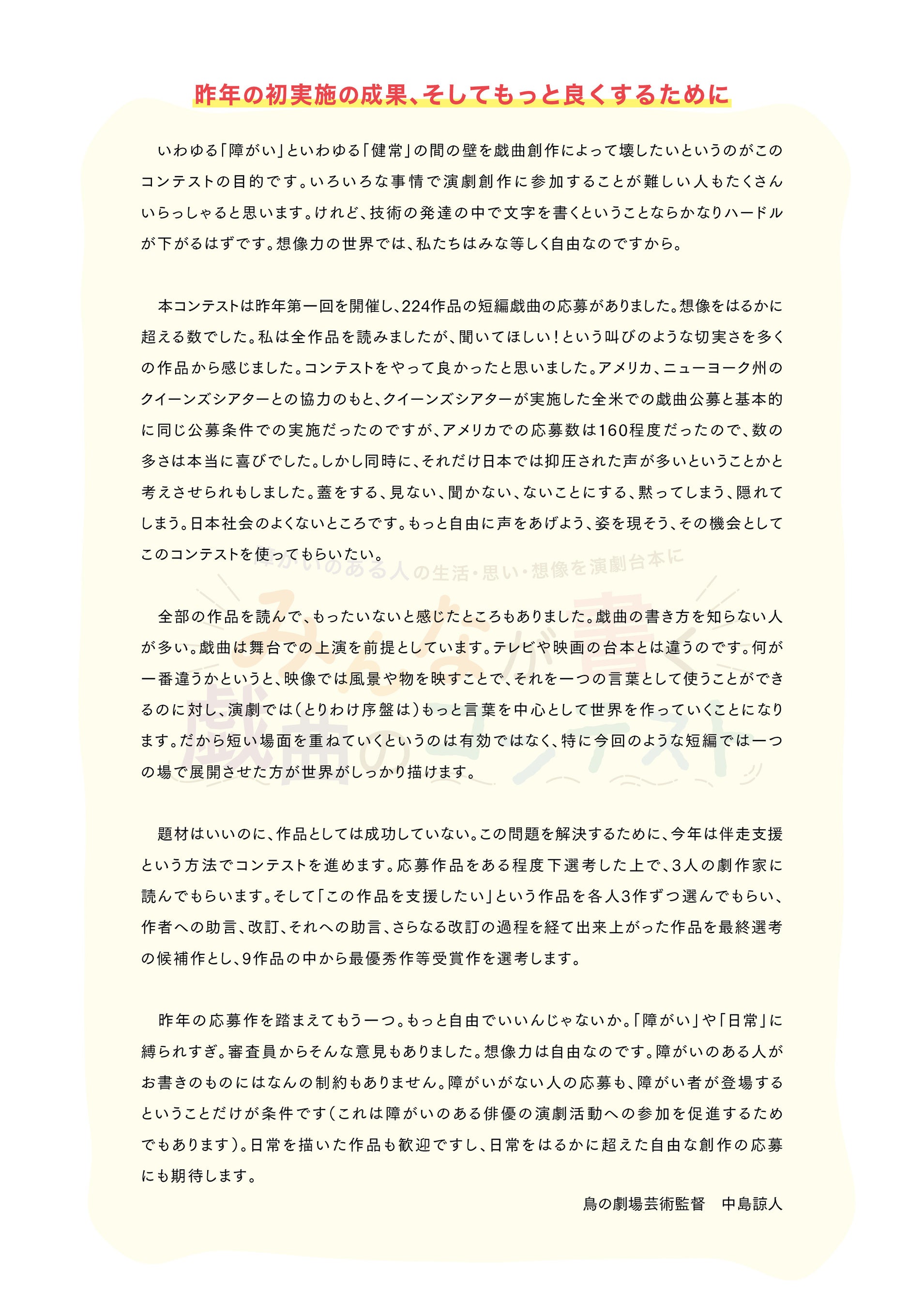 "「みんなが書く戯曲のコンテスト」の"みんな"とはいったいなんでしょうか。わざわざ"みんな"と言わなければならないのは、どうしてでしょうか。普段人々が使う"みんな"とは、マジョリティの人たちを指す場合が多いように思います。もしあなたがそこで「みんなに含まれない」と思っても、このコンテストは、あなたの作品を待っています。"
