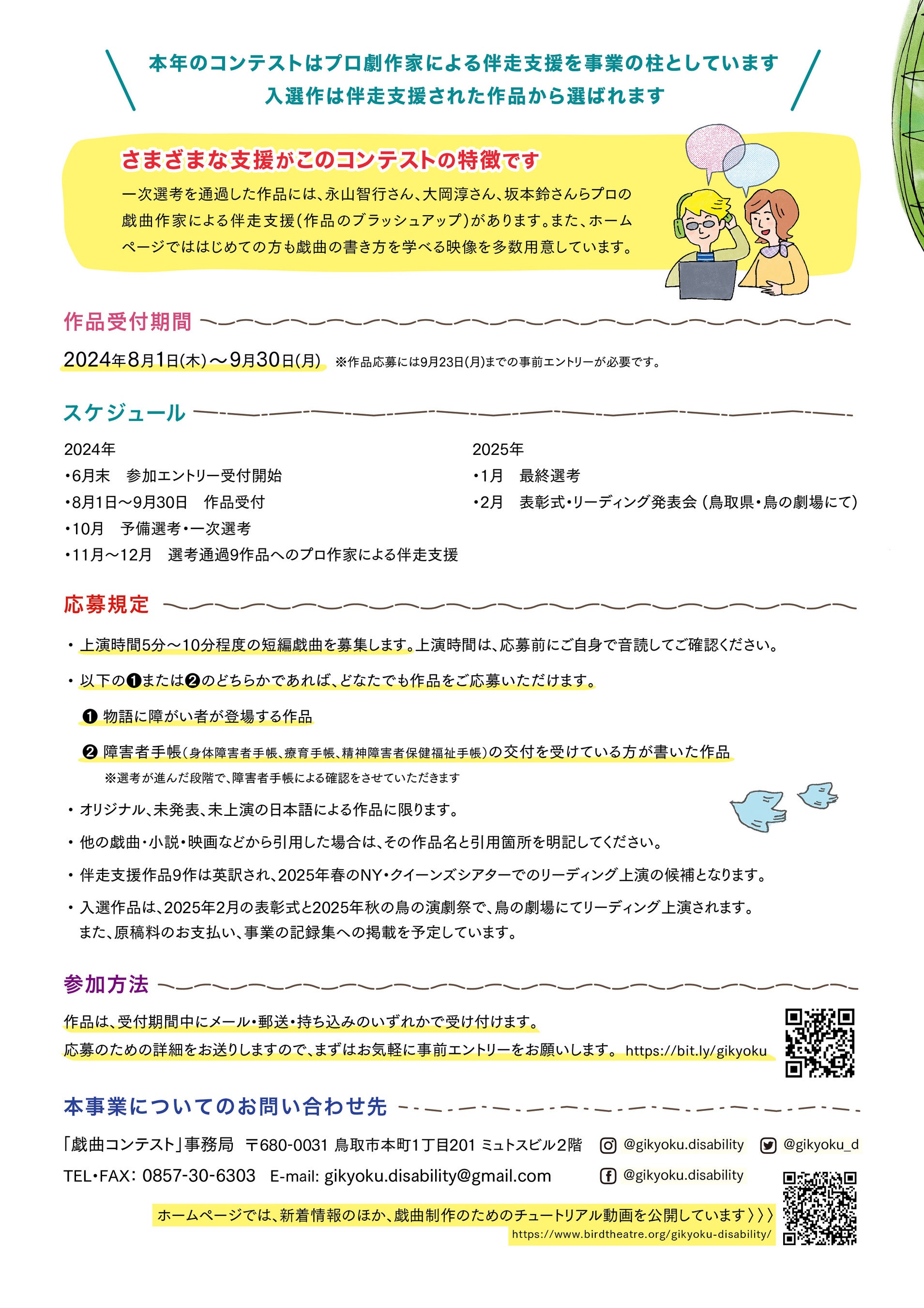今年度は新たな試みとして、プロの戯曲作家3名が応募作品へ伴走支援を行うことで、作品のブラッシュアップを行います。今年度は、8月1日から9月30日まで作品を受け付け、入選作品は2025年春にアメリカ・クイーンズシアターでの上演候補になるほか、同年秋には鳥取・鳥の演劇祭でのリーディング上演を予定しています。