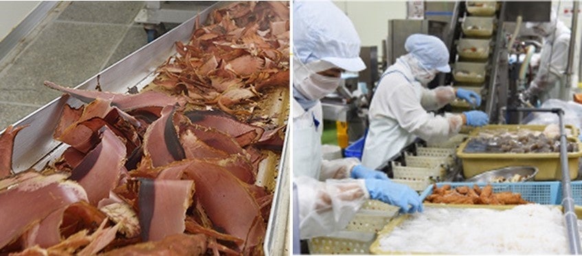 マップフーズ株式会社はグループ会社であり、主にコンビニエンスストア調理麺のスープ・たれの製造及び販売をしている会社。選び抜いたかつお節を自社で削り出しています。つゆのおいしさは《だし》で決まります。昔から料亭などでは「お客さんの顔を見てから鰹節を削れ」といわれてきたようにかつお節は削りたてが一番。自社で削り出すことに拘ることで、コクと旨味のきいた《つゆ》を製造しております。マップフーズ株式会社が製造したつゆを使用し、株式会社アイエー・フーズ工場内にておでん具材を手作業で詰めております。「拘りの製品を一人でも多くの方々へお伝えしていきたい。」従業員一人ひとりがそのような思いで製品製造をしております。