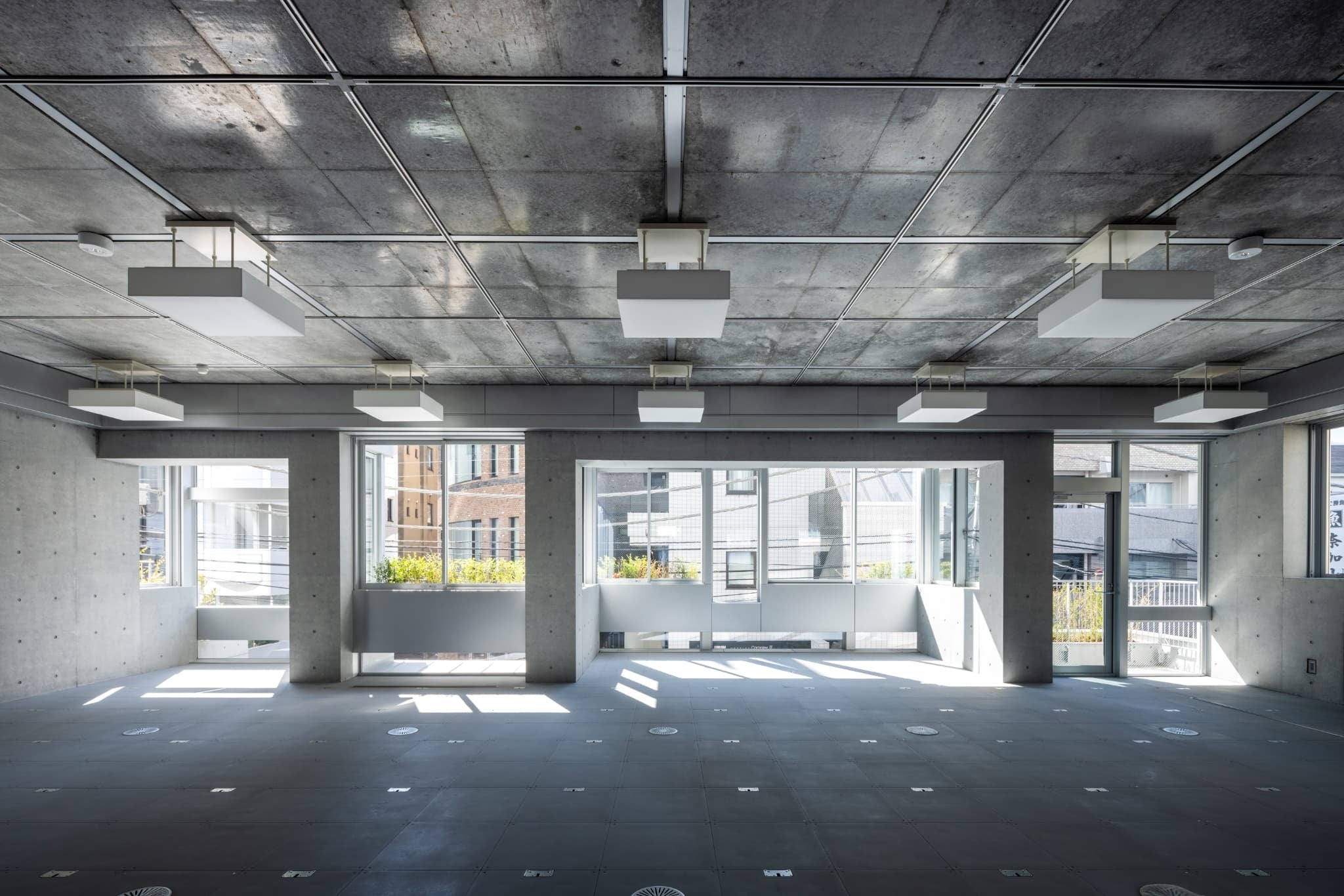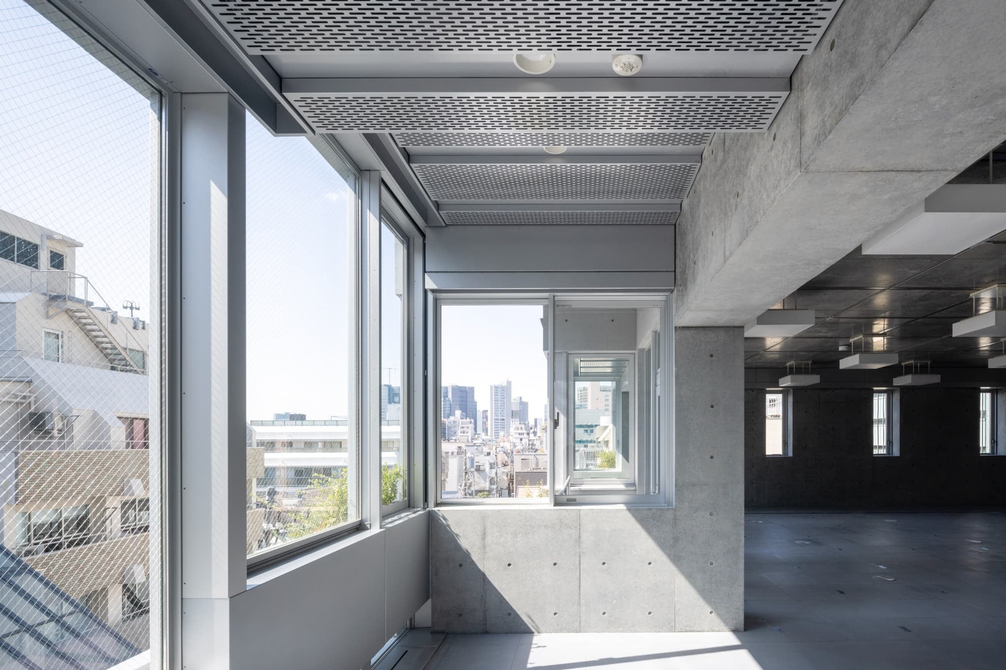 南面の外壁の凸凹部により、風が分散されて和らぎ、風の強弱で取り入れる場所を選べる設計。飛び出した屋根が庇となることで、日射を遮り熱負荷の軽減を図りました。隣地は新居千秋都市建設設計が約20年前に設計した集合住宅で、そこから緑や外壁の凹凸を連続させることで街並みをつくりました。内部は、超高層オフィスビルのワンスパン程度のスケール感で柱の無い約12m角の内部空間を形成し、内部レイアウトを自由に使えることを目的にしています。
