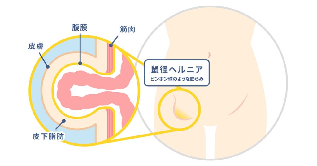 鼠径ヘルニアは、太ももの付け根(鼠径部)の筋肉に穴が開き、鼠径部の膨らみを認めるとともに、腸をはじめとした臓器が外に飛び出す病態を指します。