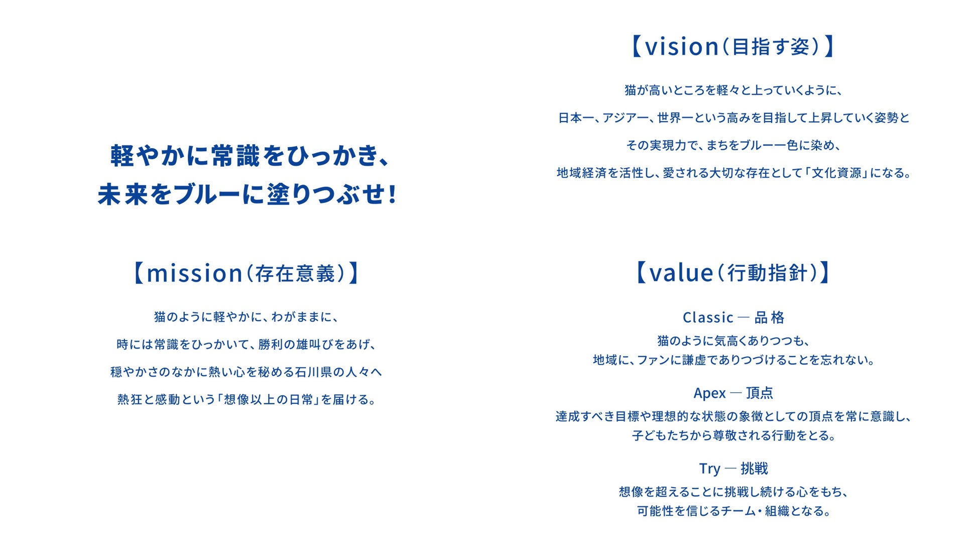 Mission・Vision・Value は『従来の常識から脱却し、地域活性を生み出す「ハブ機能」としての役割を意識した活動を通じて、クラブに集うすべての人々に「想像以上の日常」を提供したい』という蓮池代表・チームの言葉を紡ぎながら、猫を冠する唯一のトップスポーツチームならではの表現を加え、デザインしました。