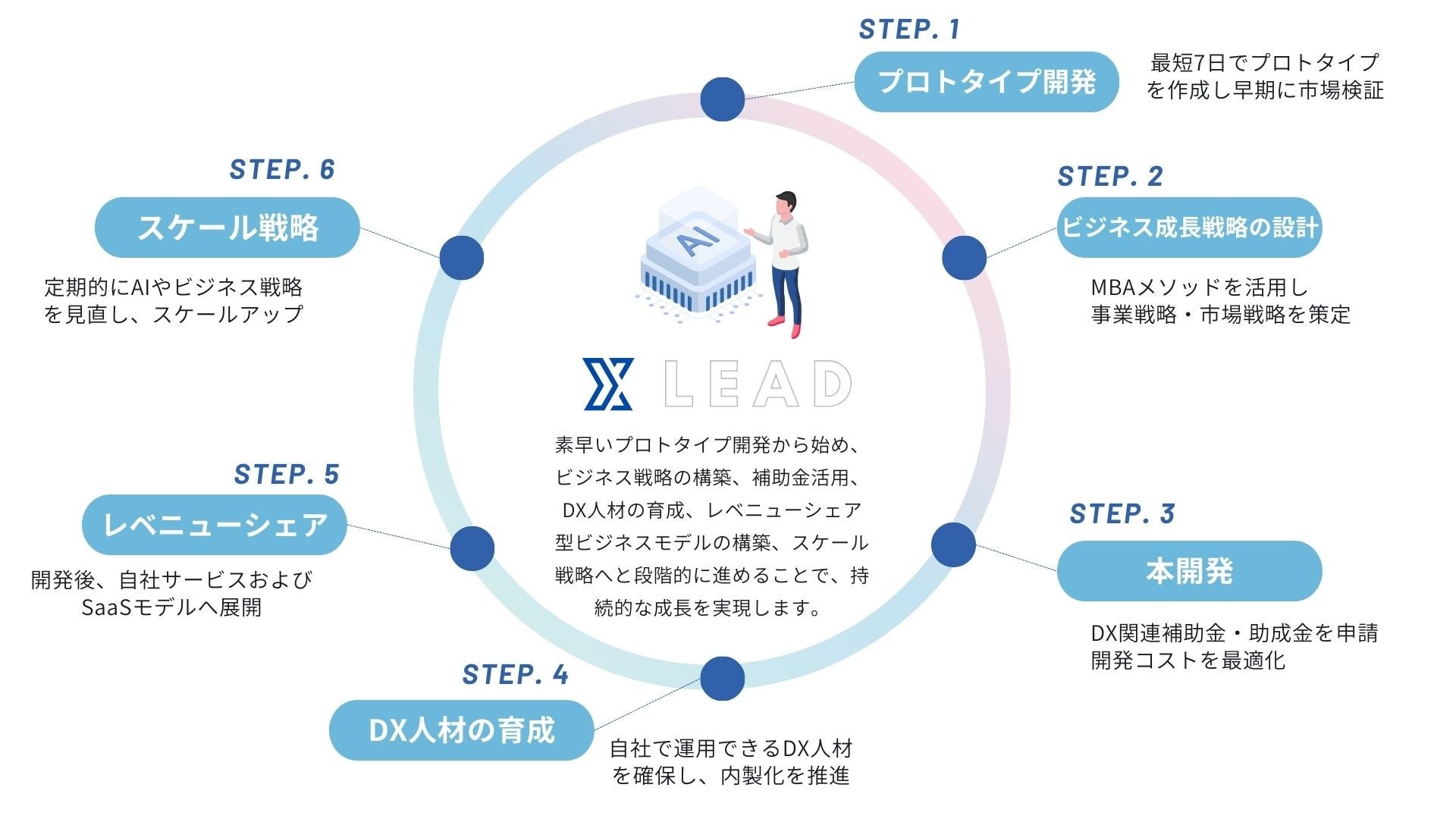 素早いプロトタイプ開発(最短7日)から始め、市場検証→戦略設計→補助金活用→DX人材育成→レベニューシェア型ビジネスモデル構築→スケール戦略へと段階的に進め、持続的成長を実現します。AIや最新技術を取り入れながら、低リスクで事業推進し、内製化を促進。事業が軌道に乗った後は、SaaS展開などで収益最大化を図り、市場変化に対応しながらスケールアップをサポートします。