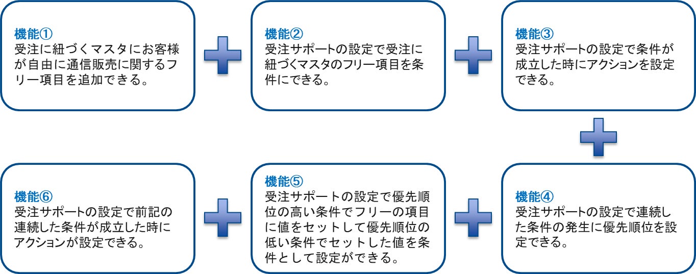 前身システムより10年以上にわたり培われた通販業務の処理ノウハウを受け継ぐ「通販Ace」。効率的かつ正統派なシステムとして開発されたこのシステムの中でも、核となる機能「フリー項目」と「受注サポート」を組み合わせることで、ほぼ無限大の自動化アクションを起こすことが可能です。さらに「優先順位」の機能を組み合わせたなら、通販事業者の課題に挑み解決する、その可能性は大きく広がります。