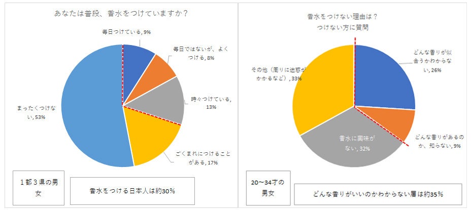 またインターネット調査によると、約70%の日本人は香水をつけないが、F1層(20~34歳の女性)を対象とした別のインターネット調査によると、35%の香水をつけない人の理由は自分に似合う香りや、どんな香りがあるのか分からないから香水をつけていないと回答しています。