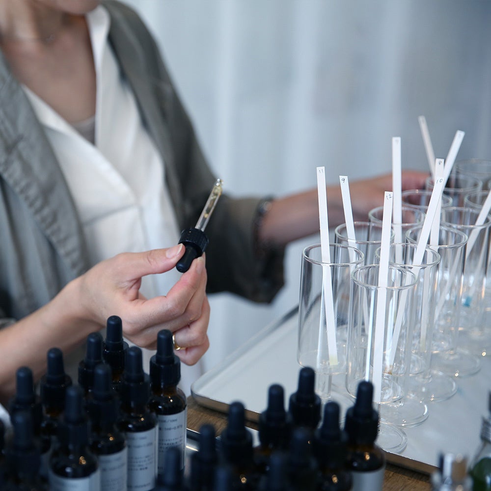 オーガニックコスメ原料の輸入販売で培った独自の仕入れルートで、高品質な天然香料をおよそ300種類ラインナップ。弊社の強みである豊富な天然香料ラインナップと香料の調合技術を生かし、上質で繊細なフレグランスをプロの調香師とともにお客様自身で一から作り上げることができる、体験型パーソナライズ香水の販売サービスです。