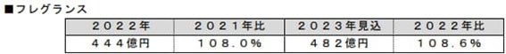 しかしながらこの数年、香りによる自己表現ニーズが高まっているほか、SNSなどの口コミが新規顧客の獲得に繋がるなど、市場は前年比8.6%増の482億円が見込まれています。