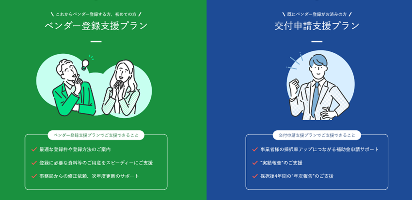 着手金0円、完全成功報酬でIT導入補助金の登録・申請をサポートいたします。これからベンダー登録をご検討中の方は、事業者登録からITツール登録はもちろん、1社1社の補助金希望ユーザー様の個別対応まで、プランをご用意しております。