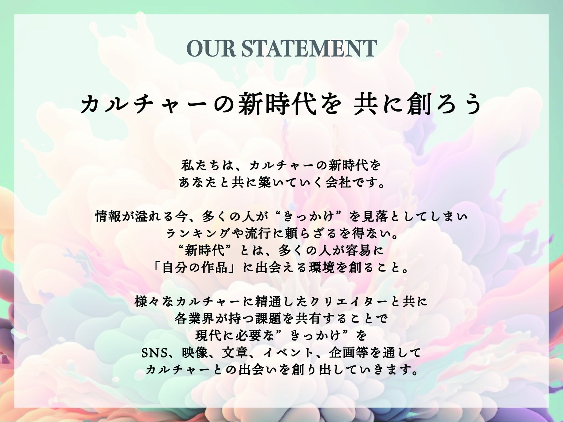 「カルチャーの"新時代"を共に創ろう」というステートメントのもと、映画感想TikTokクリエイター「しんのすけ」、小説紹介クリエイター「けんご」、アート紹介クリエイター「耳で聴く美術館」の3人を中心とした所属クリエイターと、各企業様・クリエイター様と共にプロモーションや企画開発を行っていきます。
