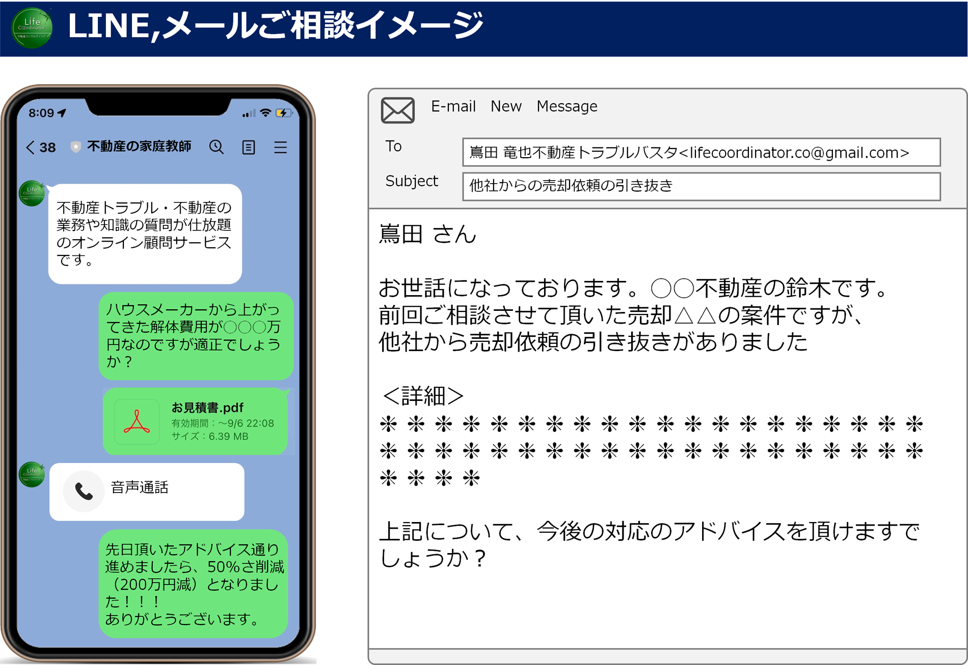 株式会社ライフコーディネーターでは、不動産事業者向けの顧問サービス(不動産トラブルバスター/不動産の家庭教師)以外に、同サービスの個人向けも展開しております。