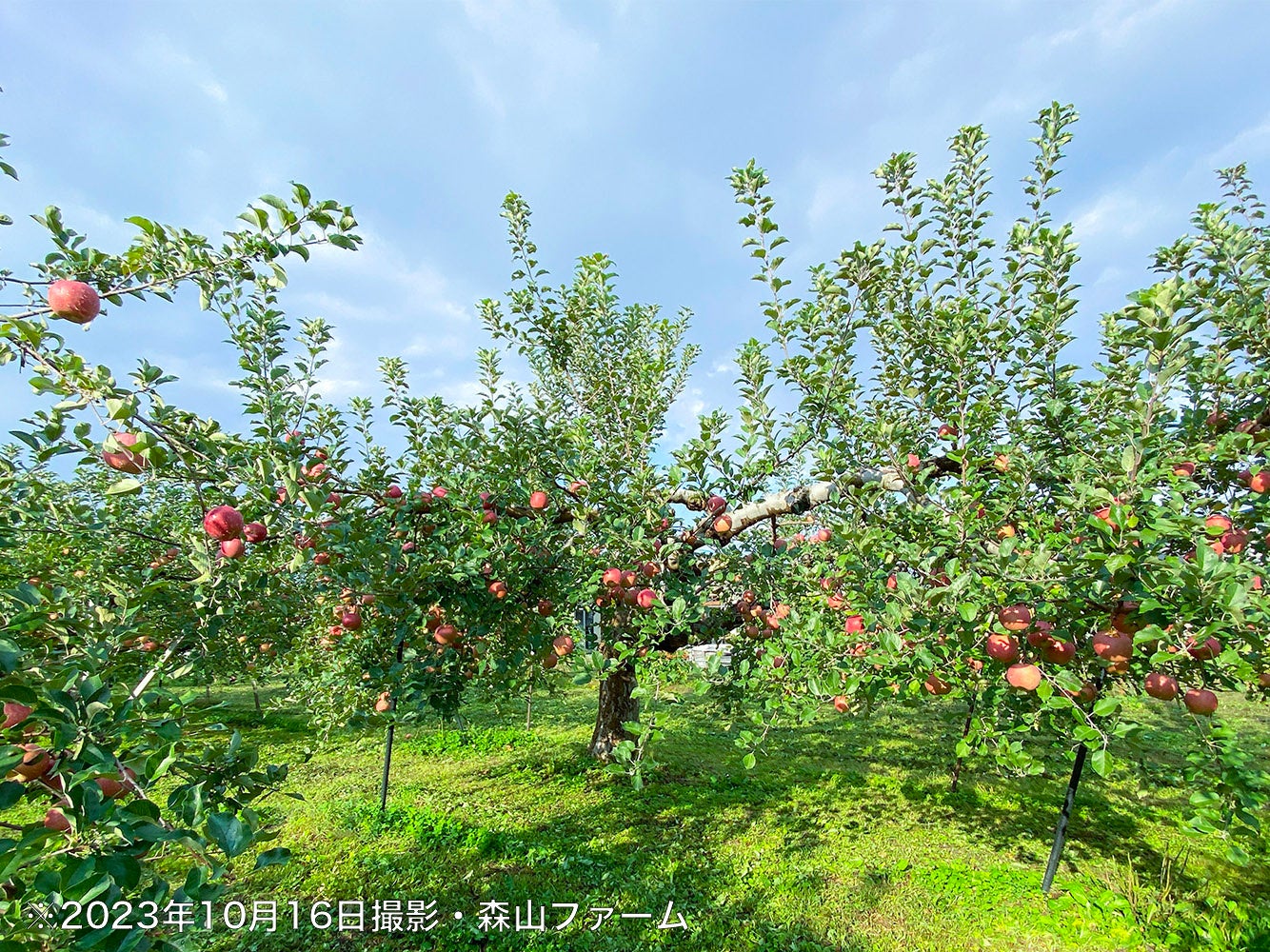 今回のりんごは実験区のりんごではないため酵素の効果はありませんが、森山ファームではもともと低農薬の独自の方法で作物を育てていて、りんごも多品種を栽培しています。