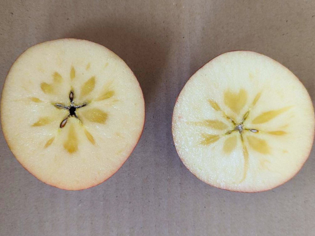 りんごの蜜は完熟の証ですが、旬の一時しか味わえません。蜜は冷蔵保存すると果実に吸収されて無くなってしまうからです。大型冷蔵庫で長期保存できるようになって、りんごは夏まで食べられるようになりましたが完熟の旬のりんごは、食感はもとより一味も二味も違います。