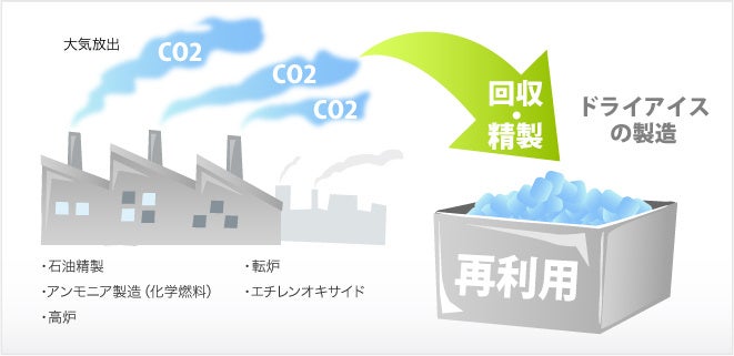 工場から排出されるCO2を回収後、資源と捉えて再利用する世界的取り組み「CCUS」が急速に高まっています。ドライアイスは、石油・アンモニア精製所・製鉄所のCO2を回収して製造されています。