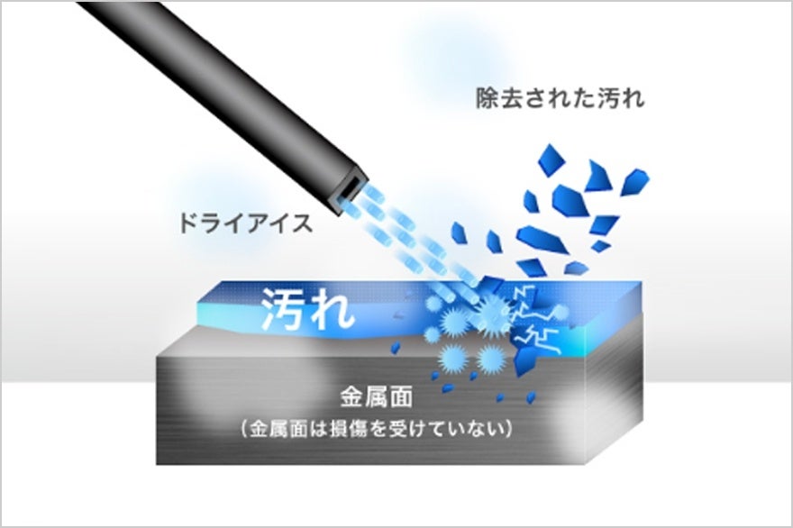 ー79℃のドライアイスにより付着物が瞬間冷却するのに対し母材が常温を保とうとします。そこで付着物と母材の温度差により、付着物に熱収縮でクラックが発生してもろくなります。