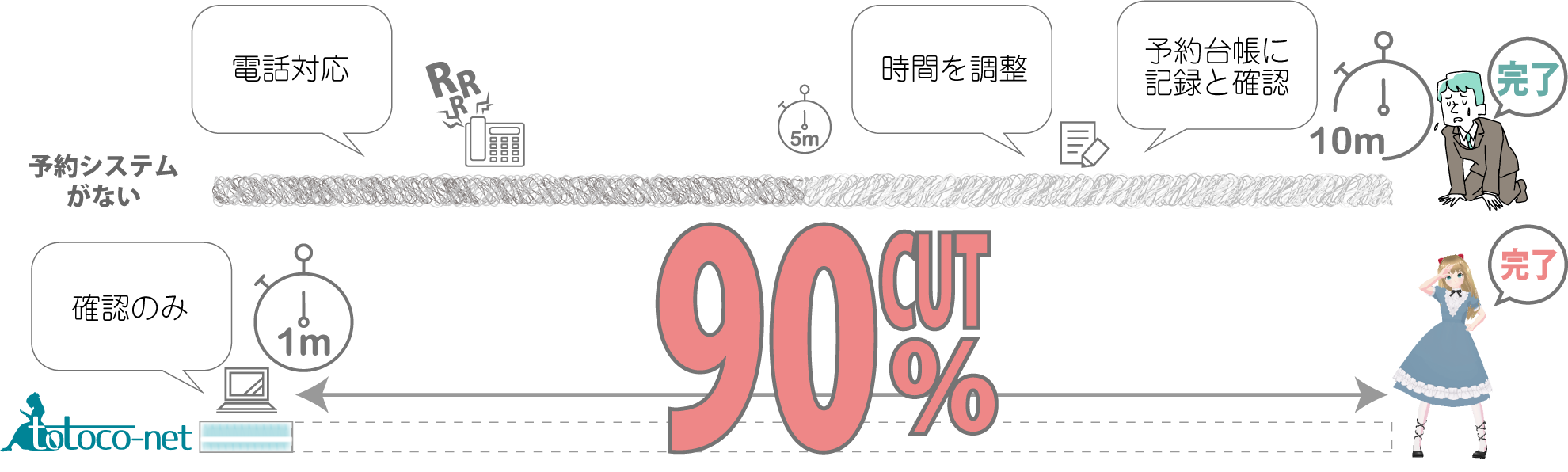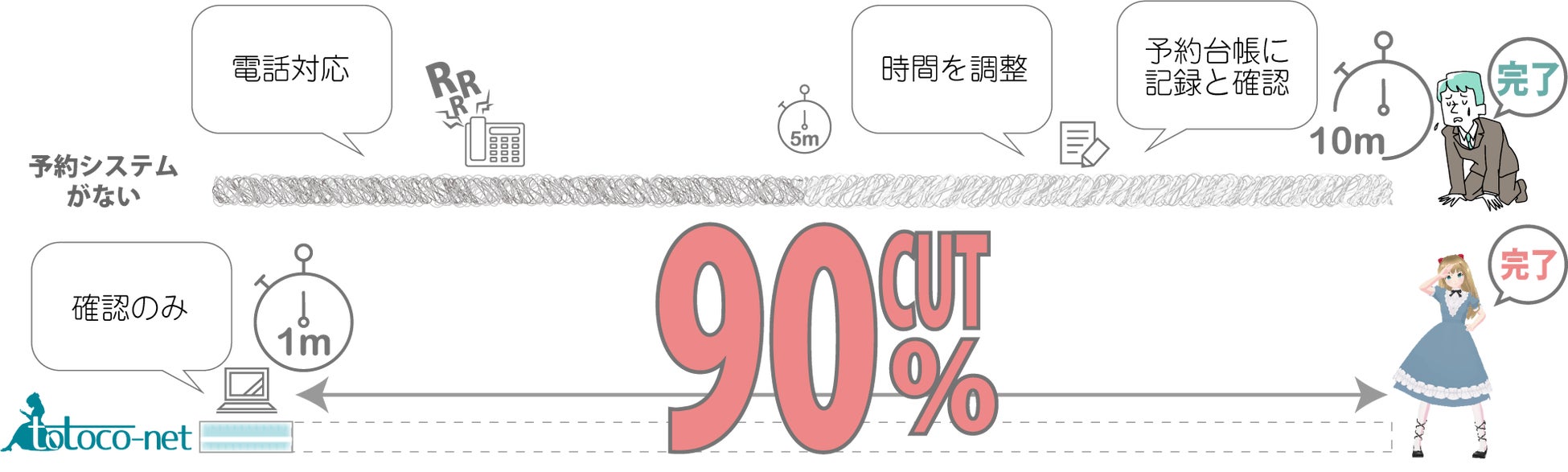 totoco-netは店舗スタッフの予約業務を90%削減します。さらに他社予約システムと比べ標準機能が充実しています。