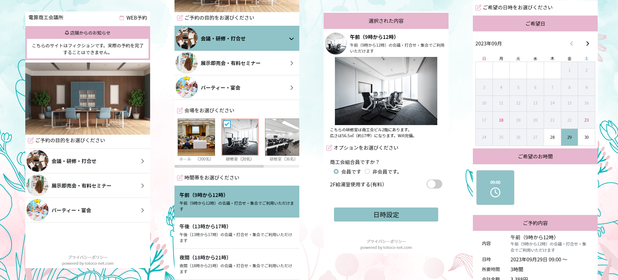 予約受付ページサンプル:レンタル会議室予約、貸しスタジオ予約、展示会場予約など