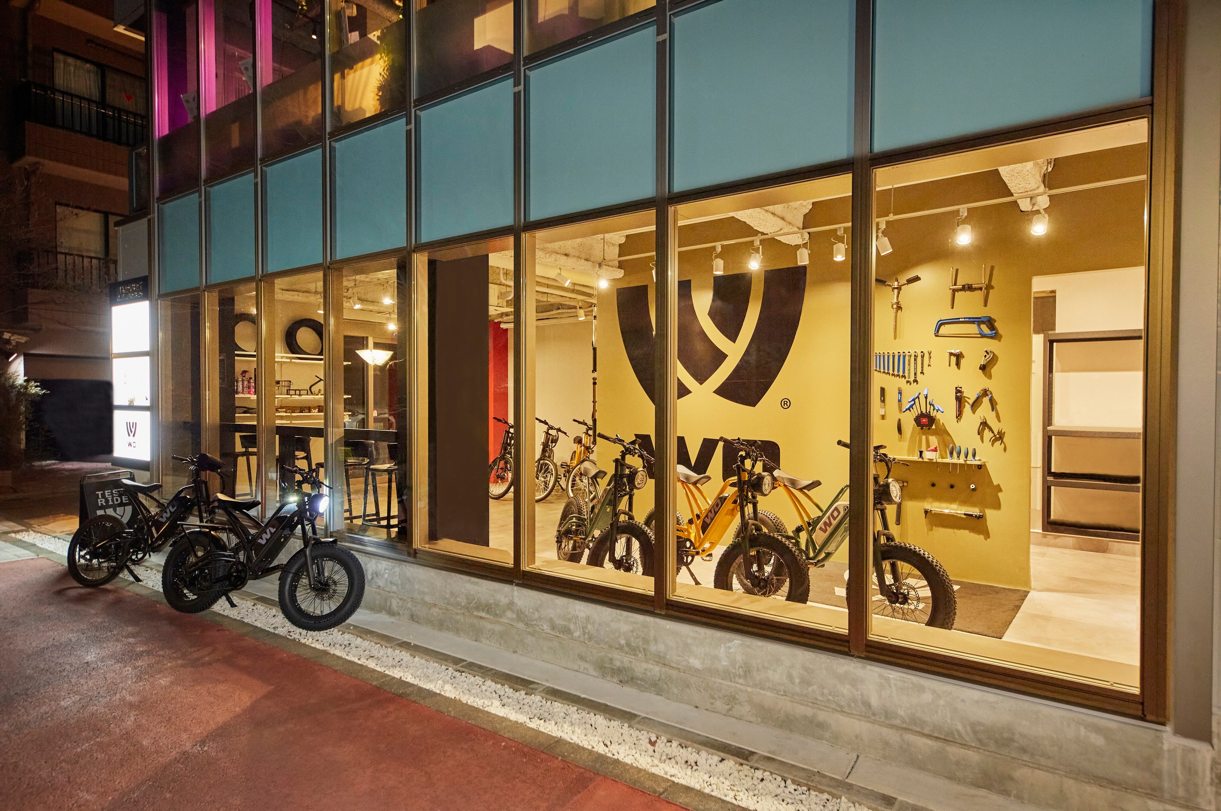 また昨今、違法の電動自転車や、オンライン販売のみで購入者の説明が不十分なまま利用されるケースが増加しています。電動バイク等を正しく理解いただき、利用いただく為に、整備等を受けられる環境を整え、また特定小型原動機付自転車の新規格を新店舗でも体験いただける場を創出することを目的にWO BIKESの旗艦店をオープンしております。