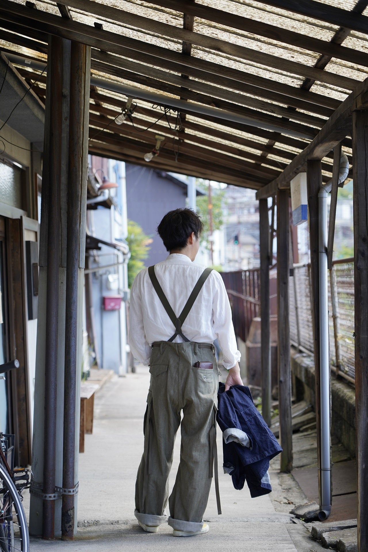 実際に触れてみると非常に肌ざわりが良くて、身に着けてみたい衝動に駆られると思います。このような素材に出会ったことで、カーゴパンツを得意としている工場としてワクワクしました。これまでのプロジェクトの第二弾では、ミリタリーアイテムの中でも人気が高く、多くのデザイナーやブランドがモチーフにもする名品とも言える「M-47」というモデルを採用しました。今回は、同じく名品とされている「M-51」をモチーフにしています。サイズ感は、サスペンダー使用もできるようにオーバーサイズにしています。