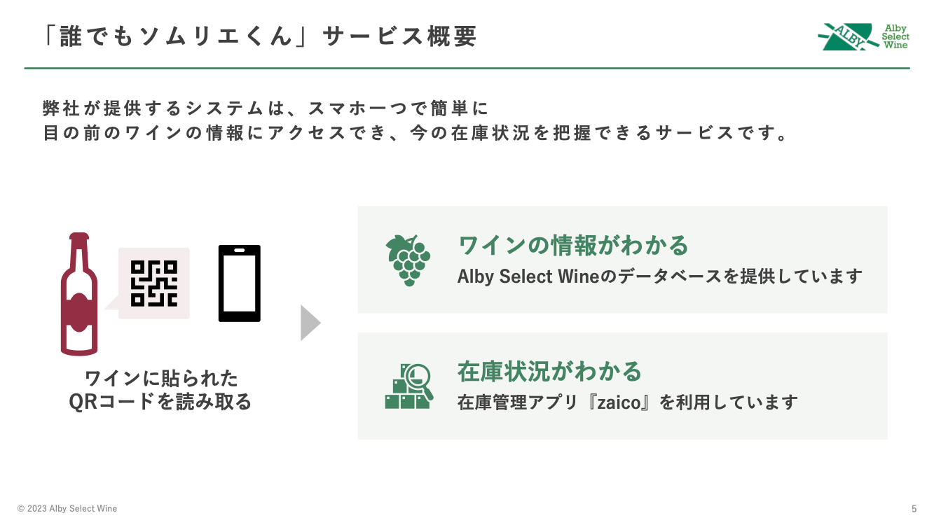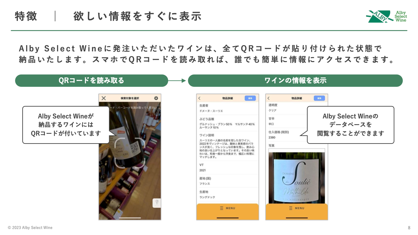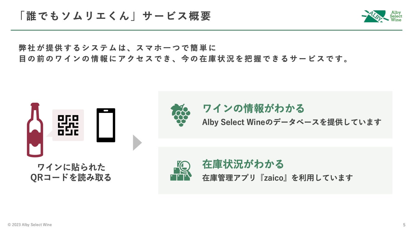 ※自社調べ (2023年9月)。日本国内の飲食業界における、「QRコードとスマートフォンを用い、納入するワインに関してのデータベース提供を含めた包括的なワイン販売ソリューション」として。