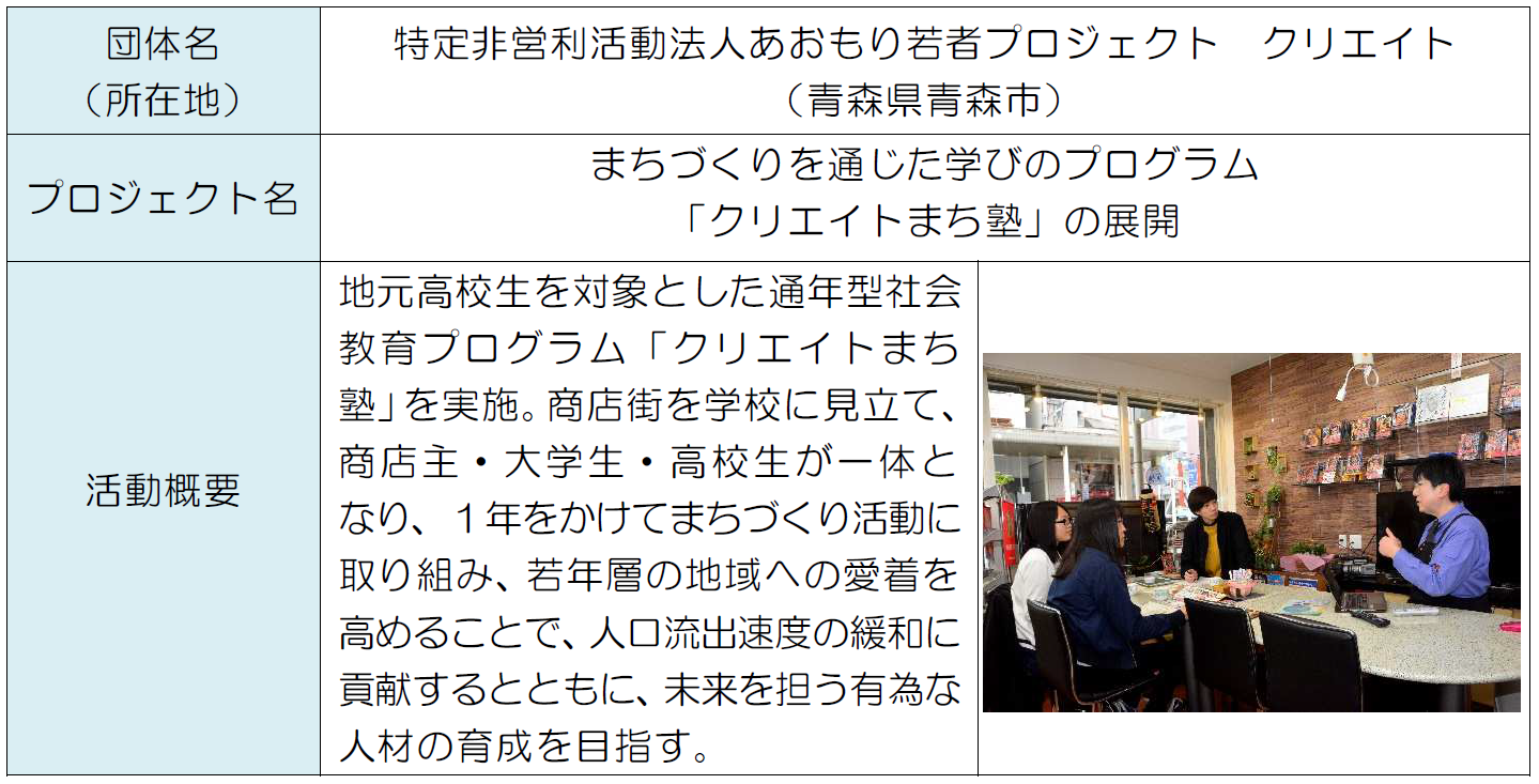 「東北・新潟の活性化応援プログラム」は、東北6県および新潟県で、地域産業の振興や地域コミュニティの再生・活性化、交流人口の拡大など、地域の課題解決に向けて自主的な活動を行っている団体を、助成金によりサポートする制度として、2017年の創設以来、これまで43団体の活動を支援しております。