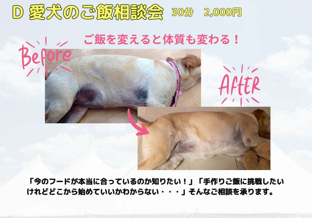 愛犬の体質診断をして、愛犬の体質に合ったフード探しのアドバイスやトッピングや手作りご飯のアドバイスも行います。